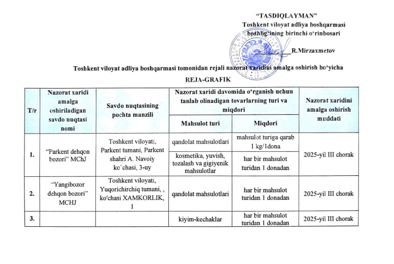 Toshkent viloyat adliya boshqarmasi tomonidan rejali nazorat amalga oshirish bo'yicha REJA-GRAFIK