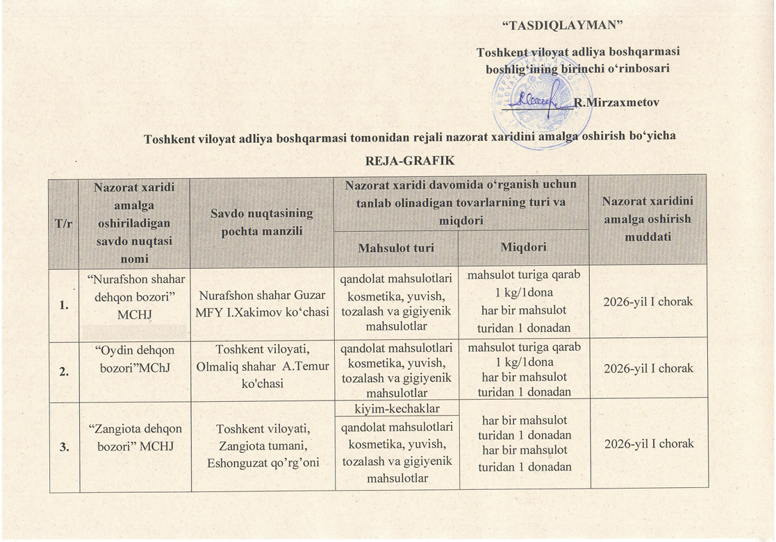Toshkent viloyat adliya boshqarmasi tomonidan rejali nazorat amalga oshirish bo'yicha REJA-GRAFIK