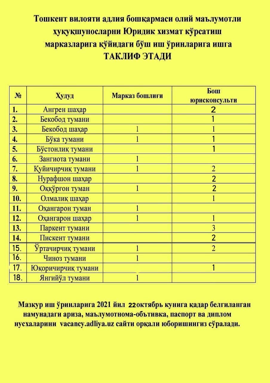 ТОШКЕНТ ВИЛОЯТИ АДЛИЯ БОШҚАРМАСИ ОЛИЙ МАЪЛУМОТЛИ ҲУҚУҚШУНОСЛАРНИ ЮРИДИК ХИЗМАТ КЎРСАТИШ МАРКАЗЛАРИГА ИШГА ТАКЛИФ ЭТАДИ.