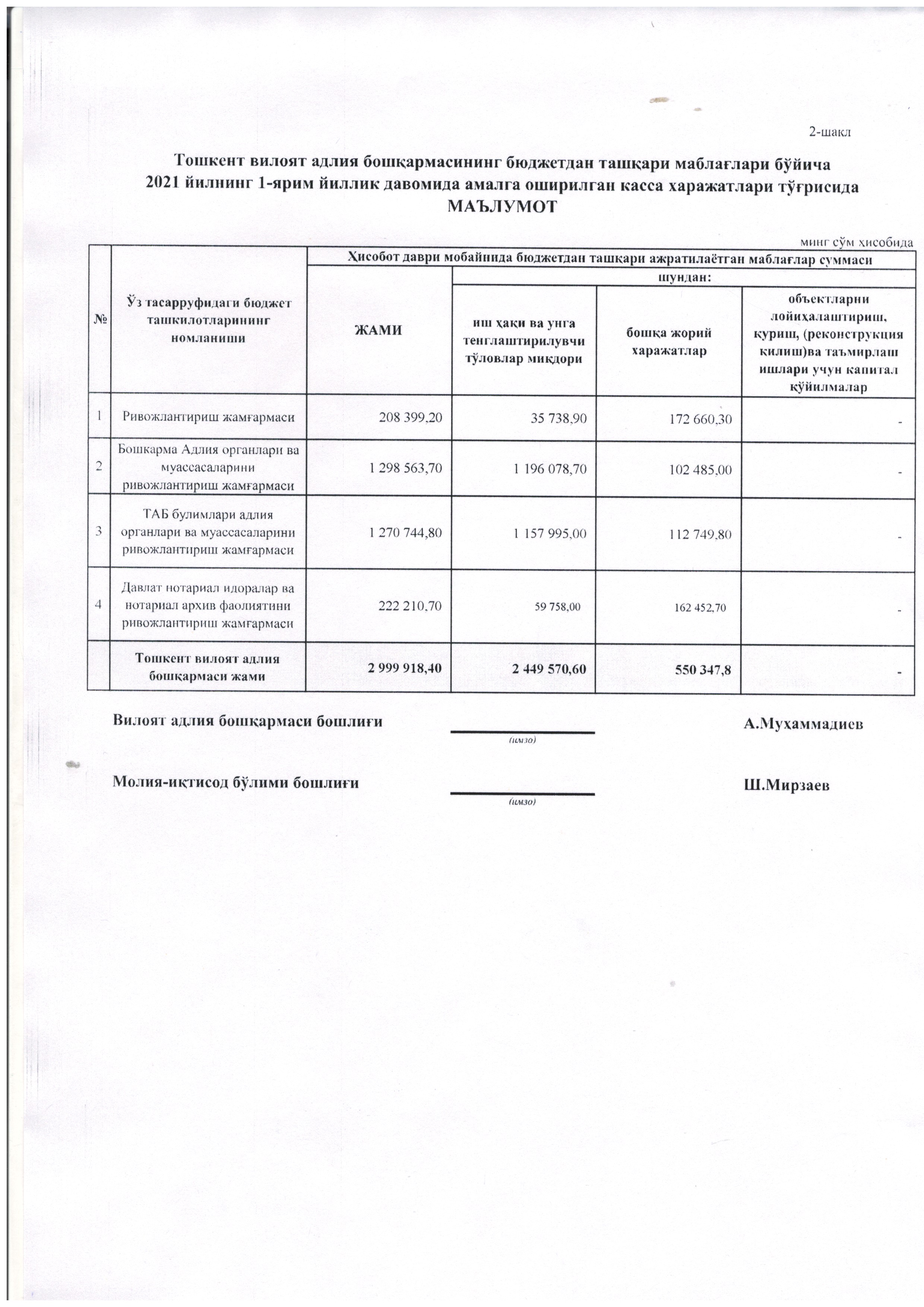 Тошкент вилоят адлия бошқармасининг бюджетдан ташқари маблағлари бўйича 2021 йилнинг 1-ярим йиллик давомида амалга оширилган касса харажатлари тўғрисида МАЪЛУМОТ