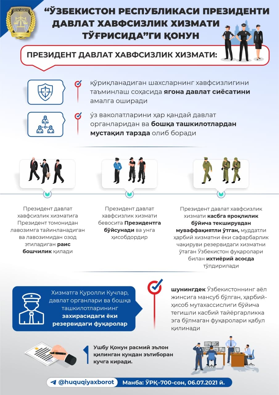 “Ўзбекистон Республикаси Президенти давлат хавфсизлик хизмати тўғрисида”ги Қонун Президент томонидан имзоланди.