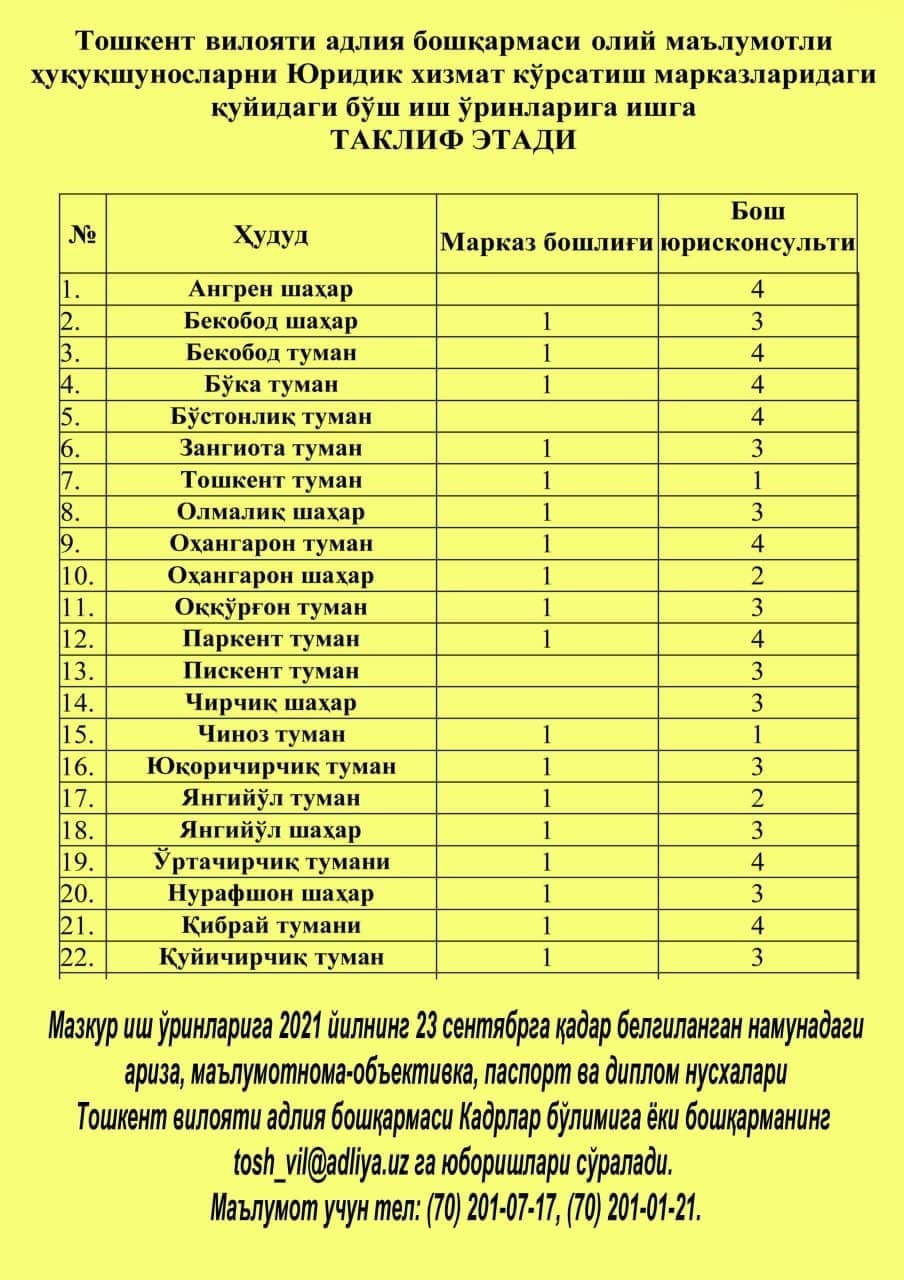 ТОШКЕНТ  ВИЛОЯТИ АДЛИЯ БОШҚАРМАСИ ОЛИЙ МАЪЛУМОТЛИ ҲУҚУҚШУНОСЛАРНИ ЮРИДИК ХИЗМАТ КЎРСАТИШ МАРКАЗЛАРИГА ИШГА ТАКЛИФ ЭТАДИ.