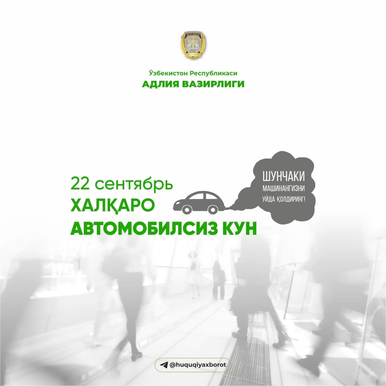 Маълумот учун: Ҳукумат қарори (https://t.me/huquqiyaxborot/8613) билан 2021 йилдан бошлаб 22 сентябрь республика бўйича “Автомобилсиз кун” сифатида эълон қилинган. Шу куни шахсий автомобилда ҳаракатланишдан ихтиёрий равишда воз кечиш тавсия этилади.