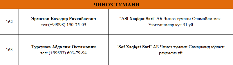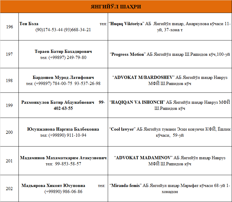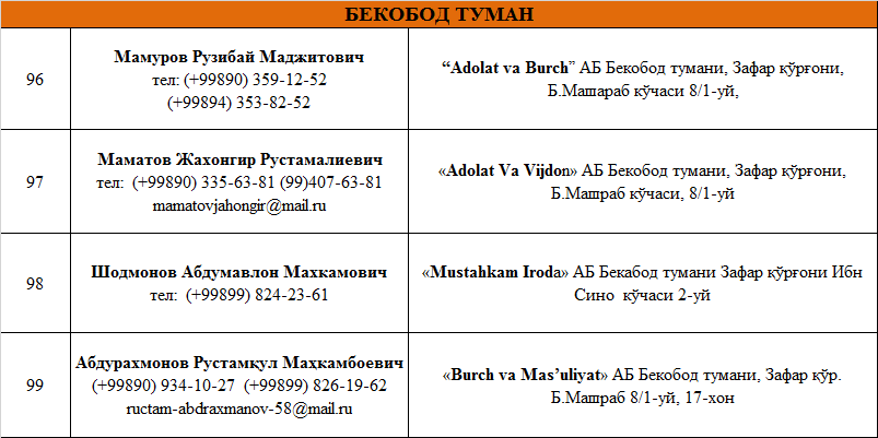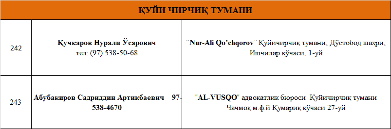 ТОШКЕНТ ВИЛОЯТИДА ФАОЛИЯТ ЮРИТУВЧИ АДВОКАТЛИК ТУЗИЛМАЛАРИ РЎЙХАТИ