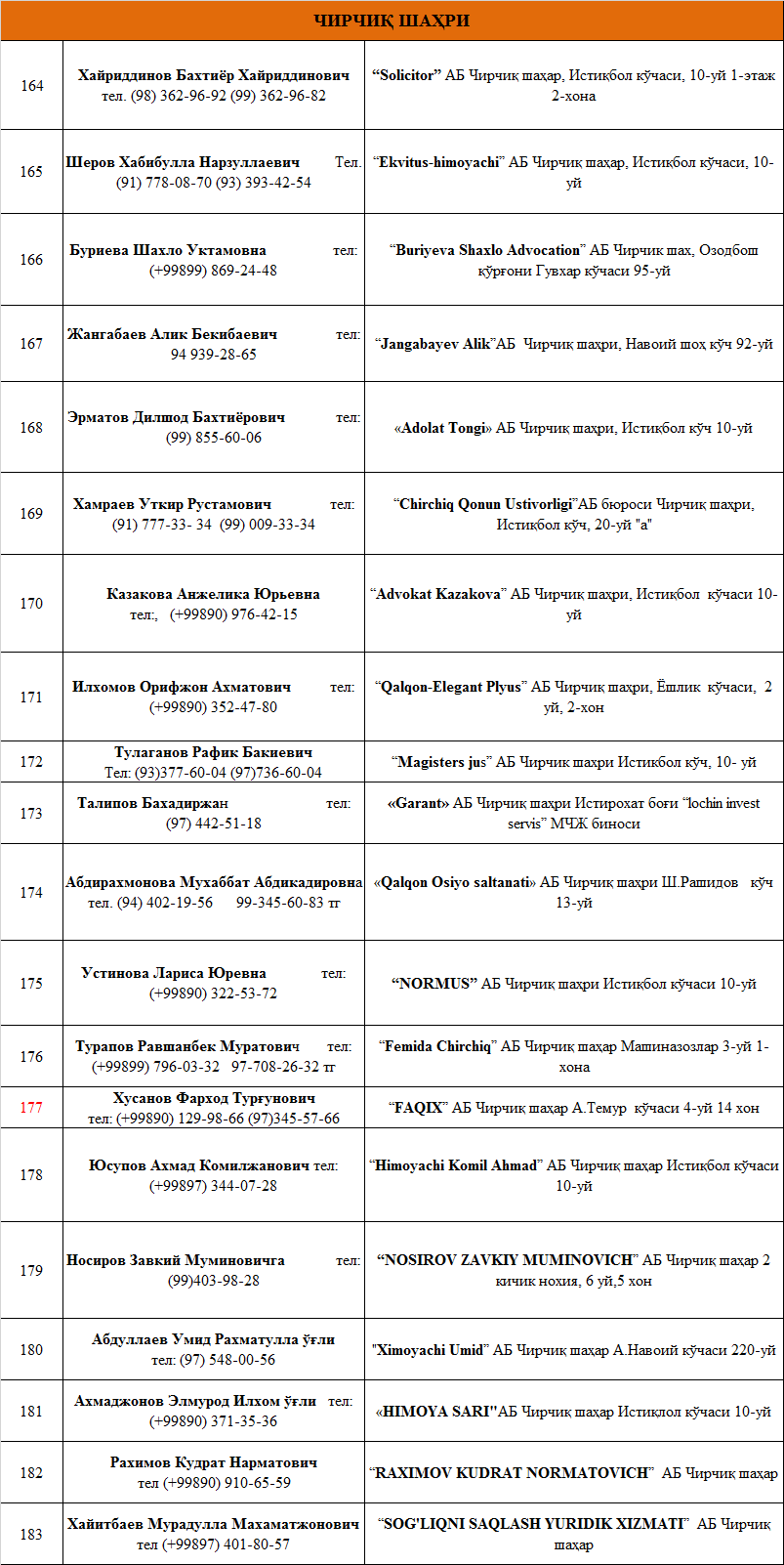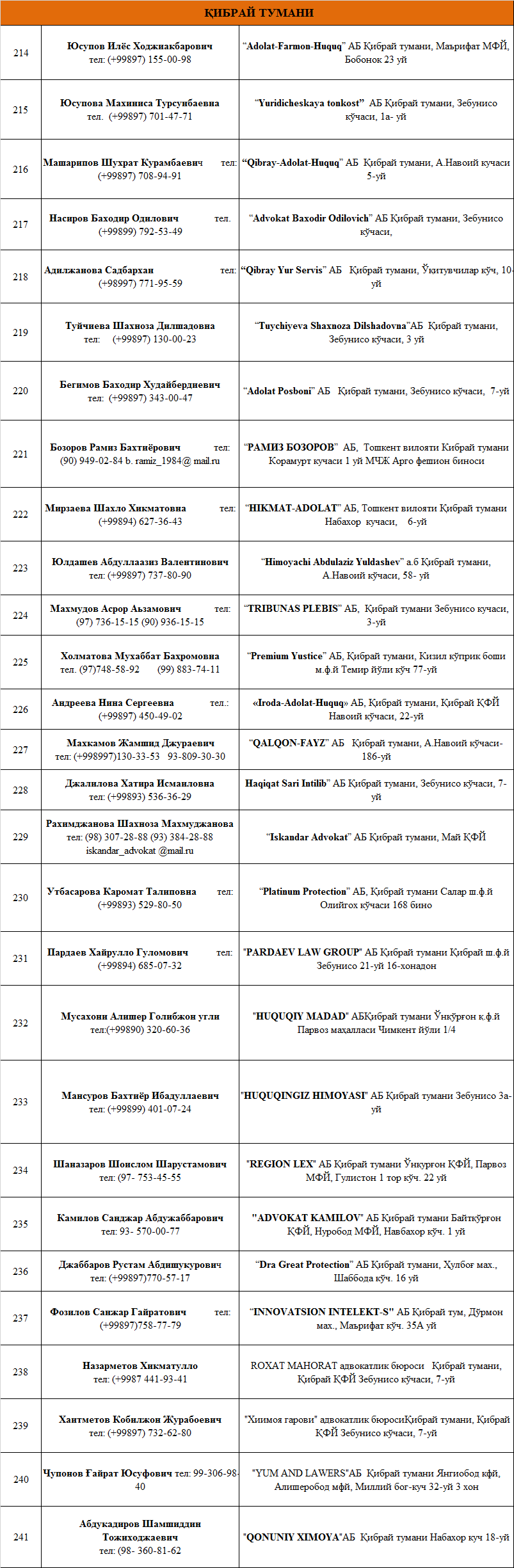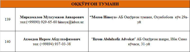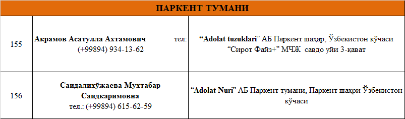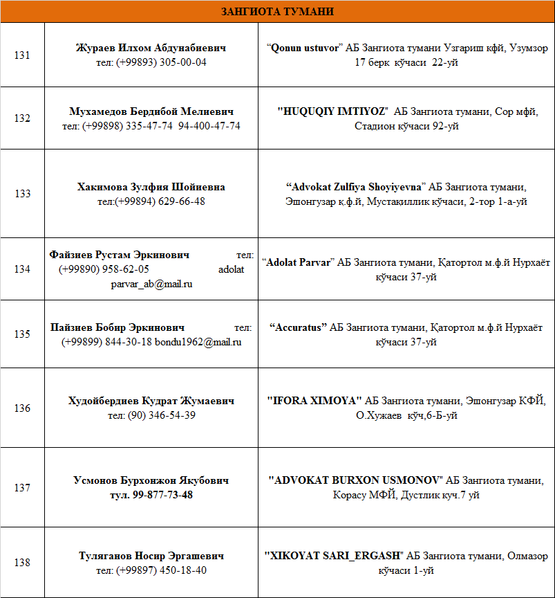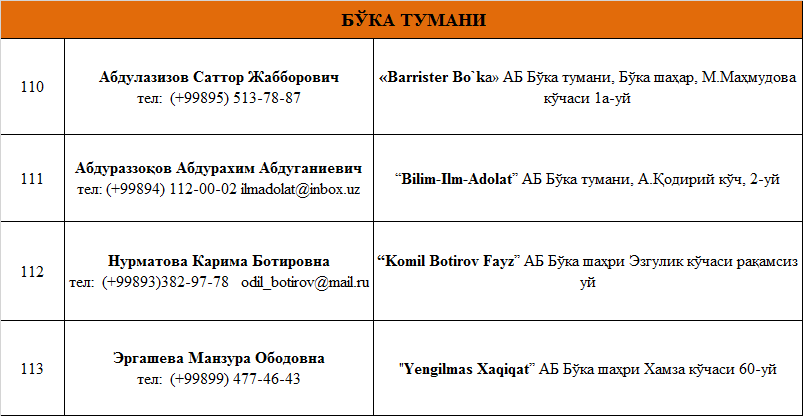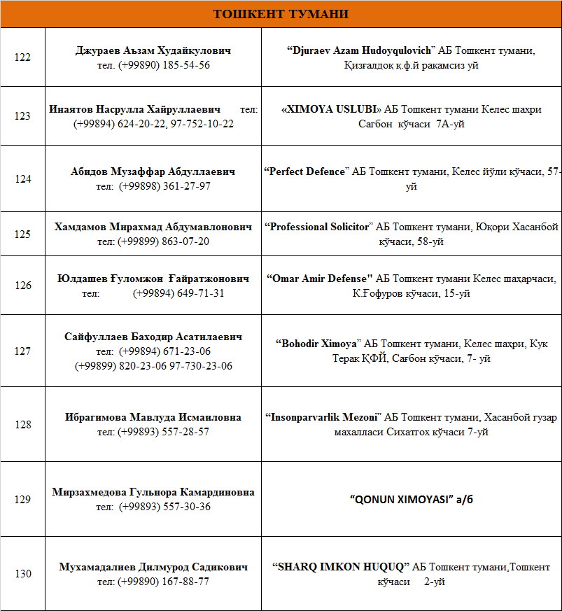 ТОШКЕНТ ВИЛОЯТИДА ФАОЛИЯТ ЮРИТУВЧИ  АДВОКАТЛИК  ТУЗИЛМАЛАРИ РЎЙХАТИ