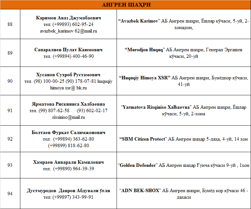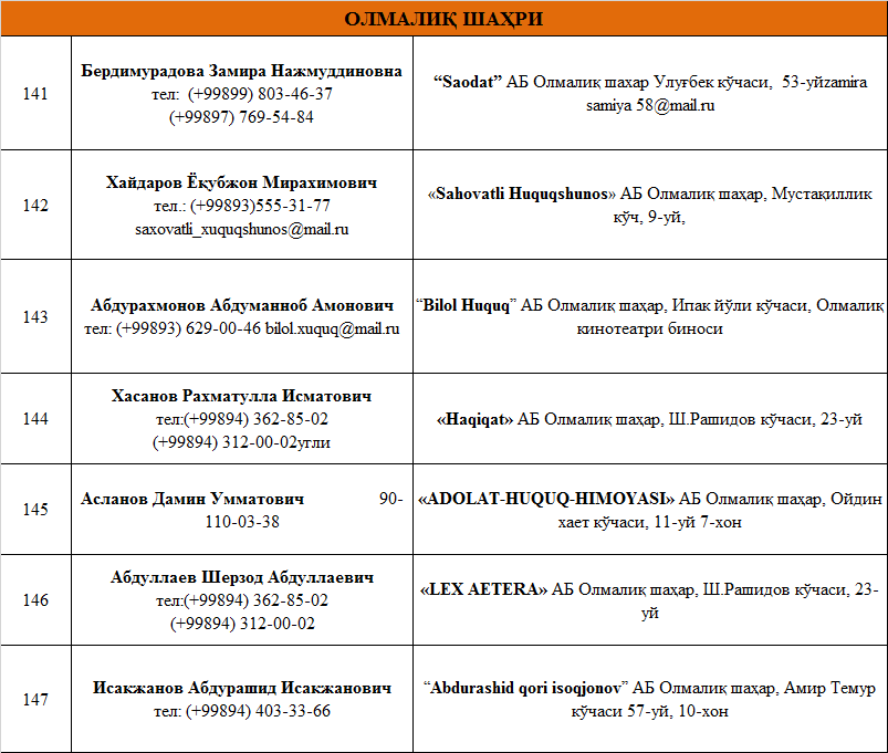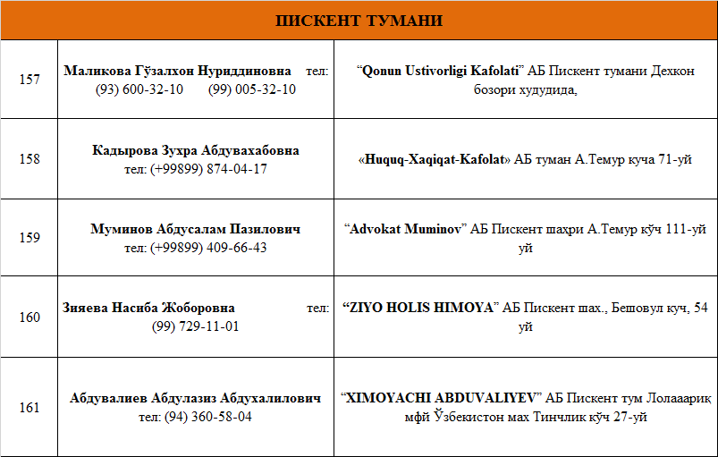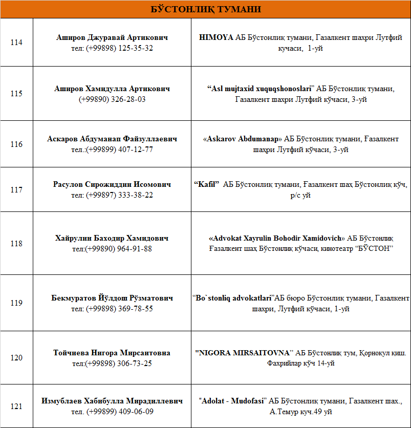 Юридик ёрдамга бўлган эҳтиёжларингизни қаноатлантиришни истасангиз Тошкент вилоятида фаолият юритувчи  адвокатлик тузилмаларининг рўйхати билан танишинг