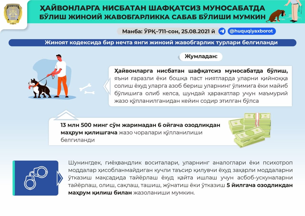 Ҳайвонларга нисбатан шафқатсиз муносабатда бўлиш жиноий жавобгарликка сабаб бўлиши мумкин.