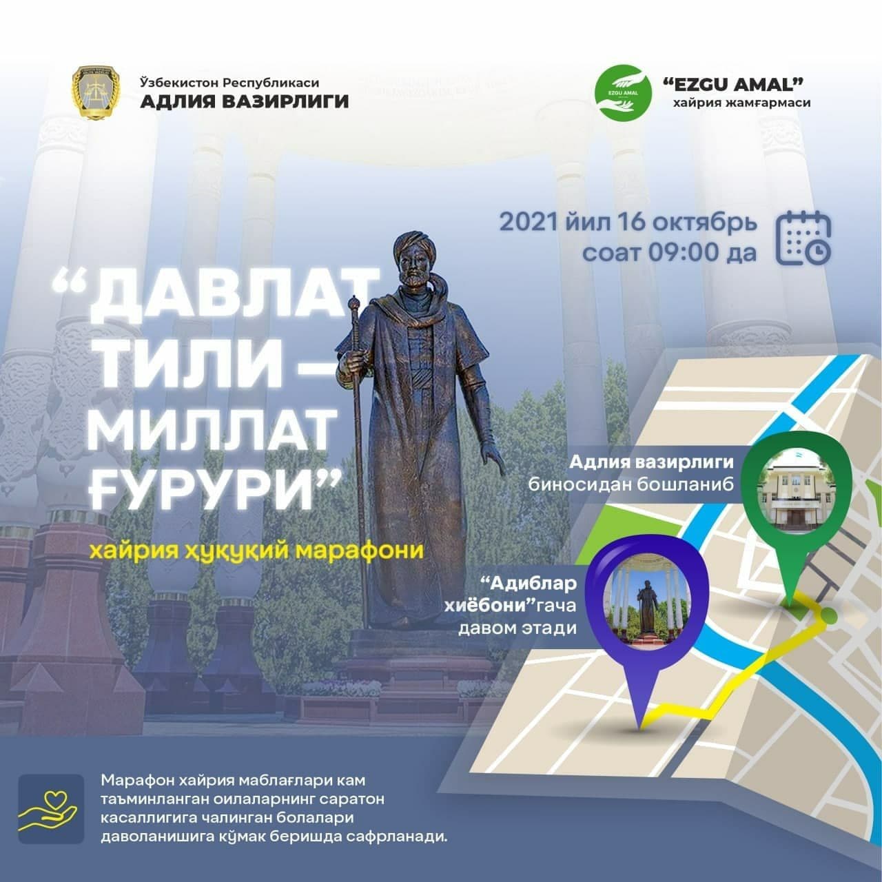 "Ezgu amal" хайрия жамғармаси билан ҳамкорликда "Ўзбек тили байрами" куни муносабати билан Тошкент шаҳрида “Давлат тили – миллат ғурури” шиори остида марафон ташкил этилади.