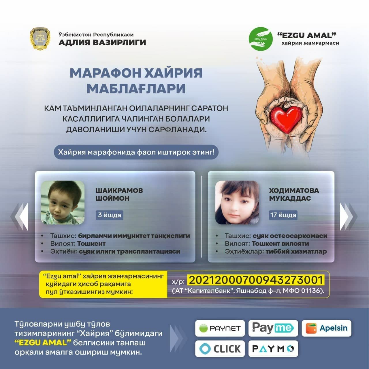 Хайрия маблағлари кам таъминланган оилаларнинг саратон касаллигига чалинган болалари даволанишига сарфланади.