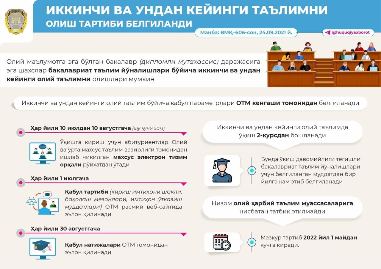 Иккинчи ва ундан кейинги таълимни олиш тартиби белгиланди