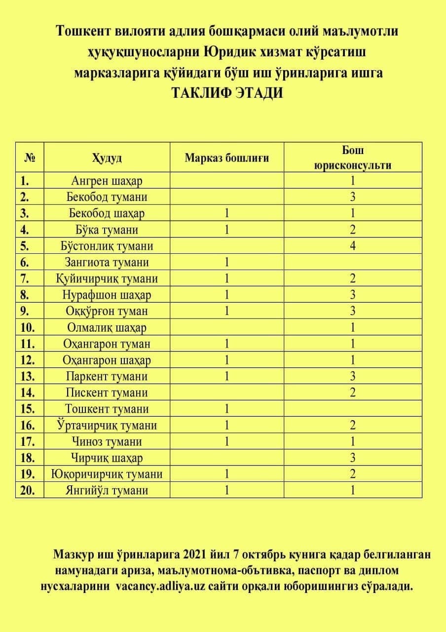 ТОШКЕНТ ВИЛОЯТИ АДЛИЯ БОШҚАРМАСИ ОЛИЙ МАЪЛУМОТЛИ ҲУҚУҚШУНОСЛАРНИ ЮРИДИК ХИЗМАТ КЎРСАТИШ МАРКАЗЛАРИГА ИШГА ТАКЛИФ ЭТАДИ.