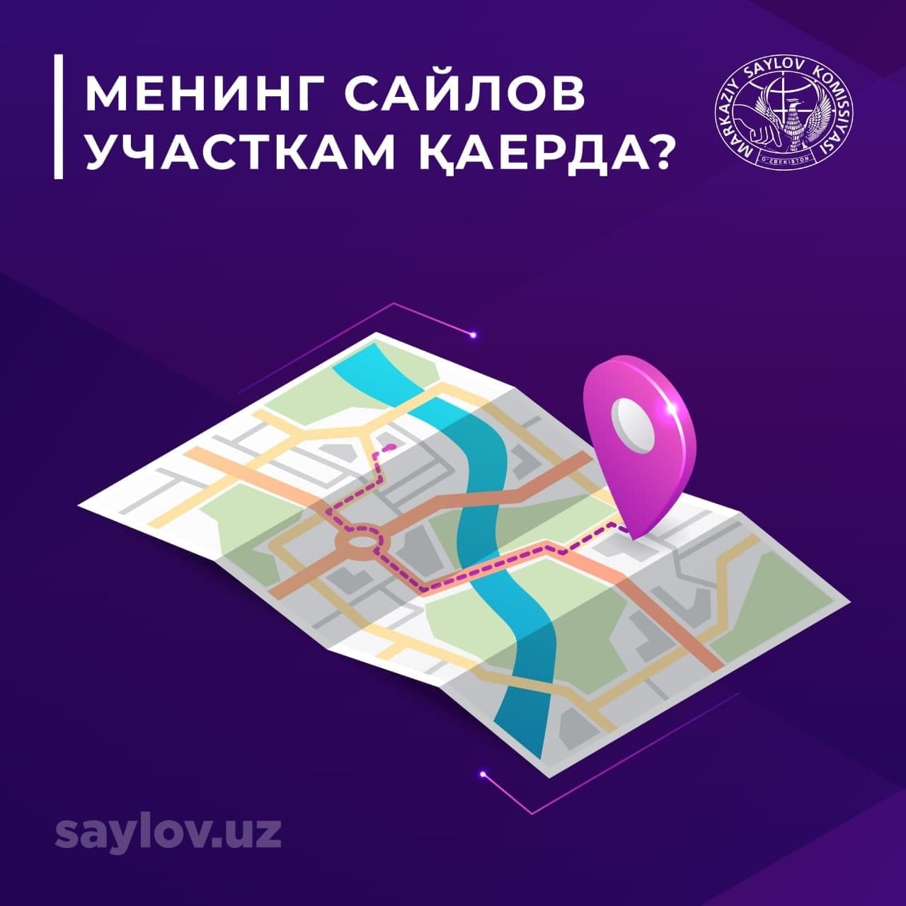 1-хизмат орқали сайловчиларнинг электрон рўйхатидан ўзингизнинг сайлов участкангизни аниқлаб оласиз. Саҳифа сўнгида геожойлашув сизга тақдим этилади.
