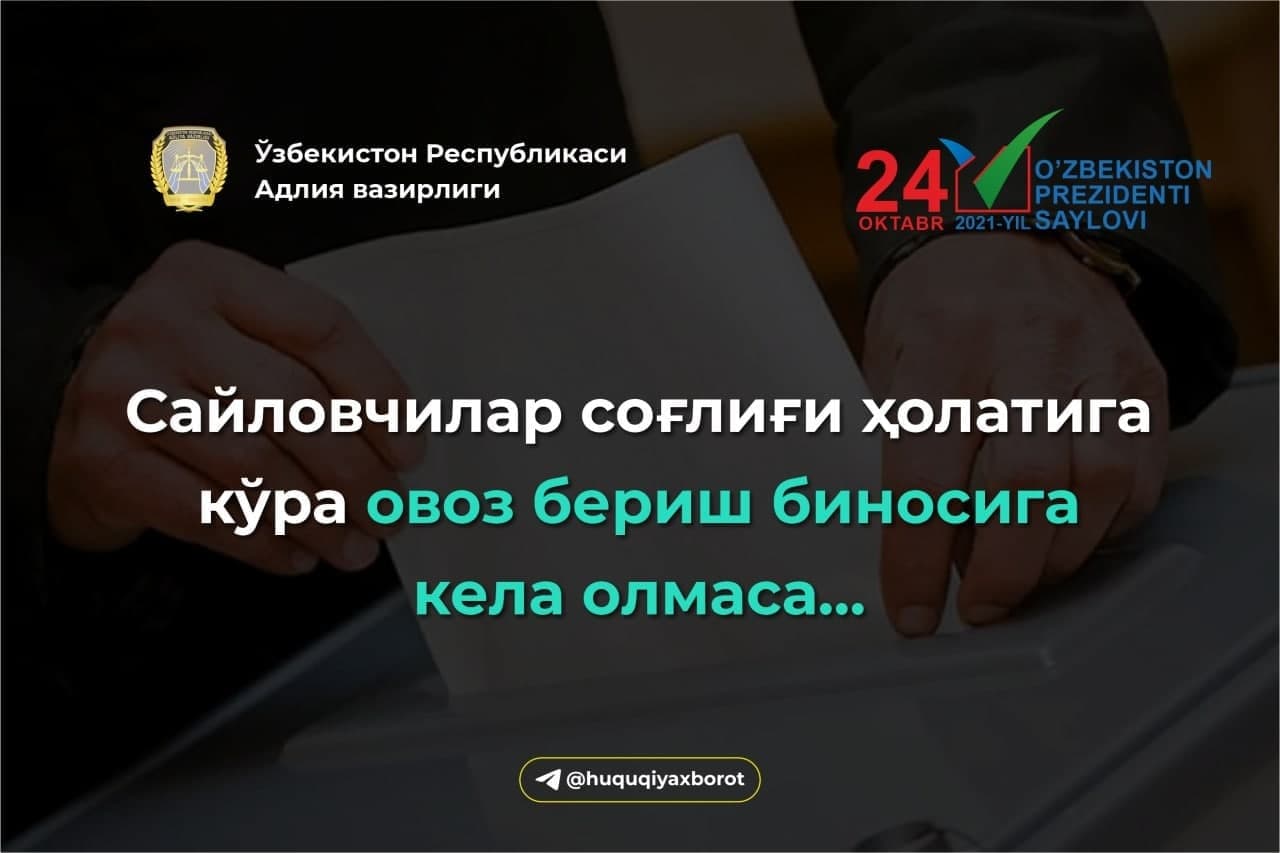 Айрим сайловчилар соғлиғининг ҳолатига ёки бошқа сабабларга кўра овоз бериш биносига кела олмаган ҳолларда, тегишли участка сайлов комиссияси овоз беришни ушбу сайловчиларнинг илтимосига биноан улар турган жойда ташкил этади.