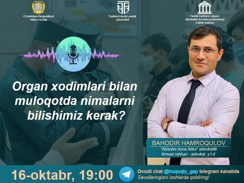 Овозли чат 16 октябрь соат 19:00да @huquqiy_gap каналида бошланади.