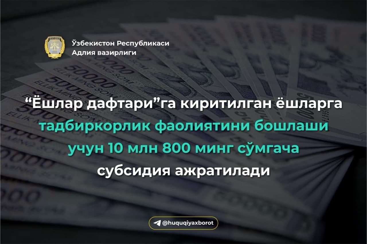 “Ёшлар дафтари”га киритилган ёшларга тадбиркорлик фаолиятини бошлаш ва ўзини ўзи банд қилишга зарур бўлган асбоб-ускуналар ва меҳнат қуролларини харид қилиш учун БҲМнинг 40 бараваридан кўп бўлмаган миқдорда “Ёшлар дафтари” жамғармалари ҳисобидан субсидия ажратилади (https://lex.uz/docs/5382151).