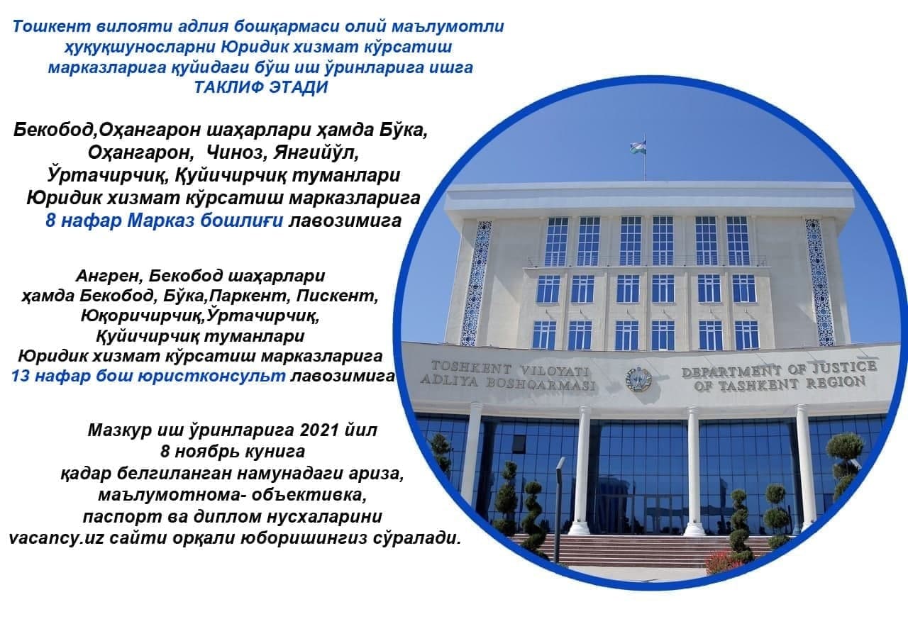 ТОШКЕНТ  ВИЛОЯТИ АДЛИЯ БОШҚАРМАСИ ОЛИЙ МАЪЛУМОТЛИ ҲУҚУҚШУНОСЛАРНИ ЮРИДИК ХИЗМАТ КЎРСАТИШ МАРКАЗЛАРИГА ИШГА ТАКЛИФ ЭТАДИ.