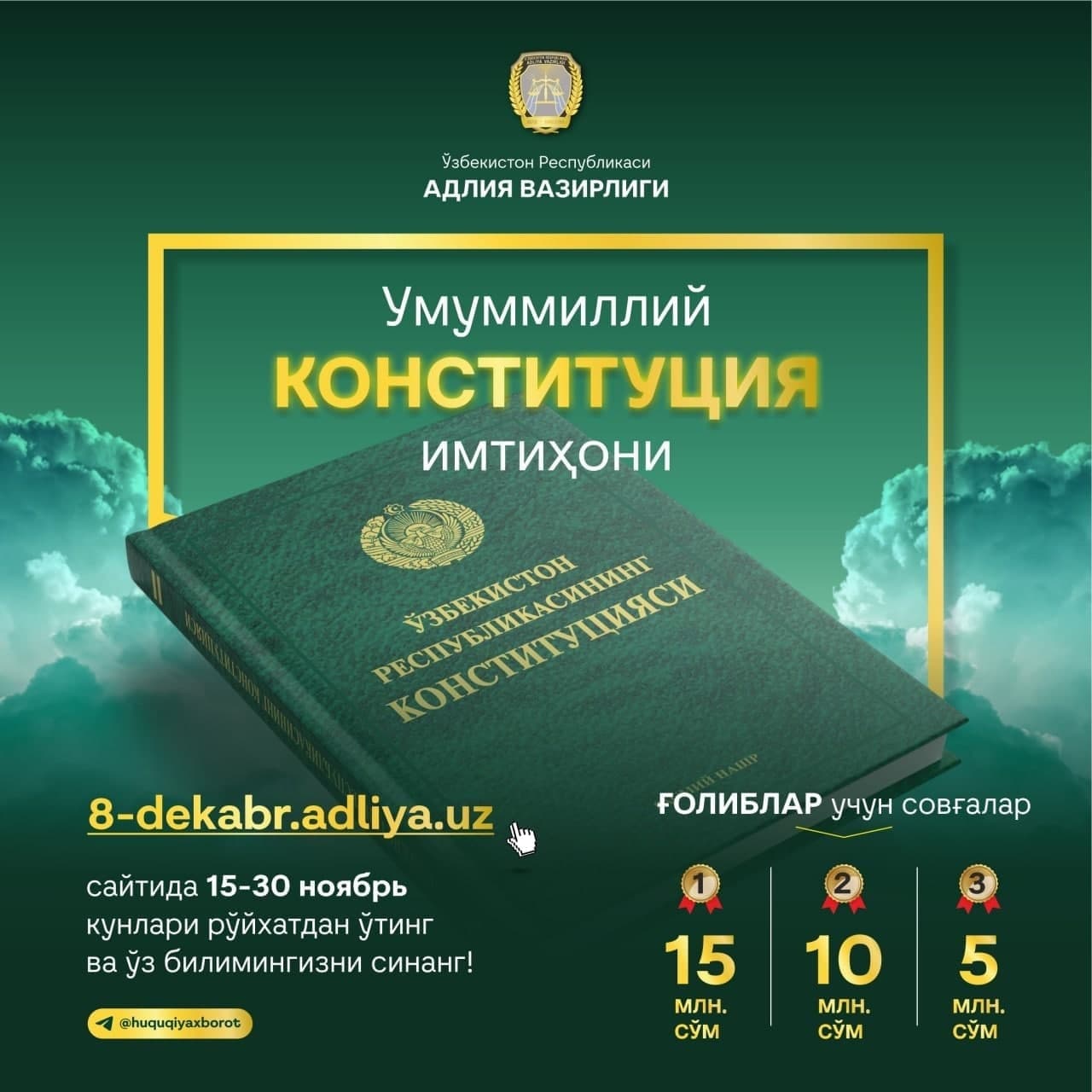 Адлия вазирлиги томонидан фуқароларнинг Конституция ҳақидаги билимларини синовдан ўтказиш мақсадида умуммиллий Конституция имтиҳони ўтказилади.