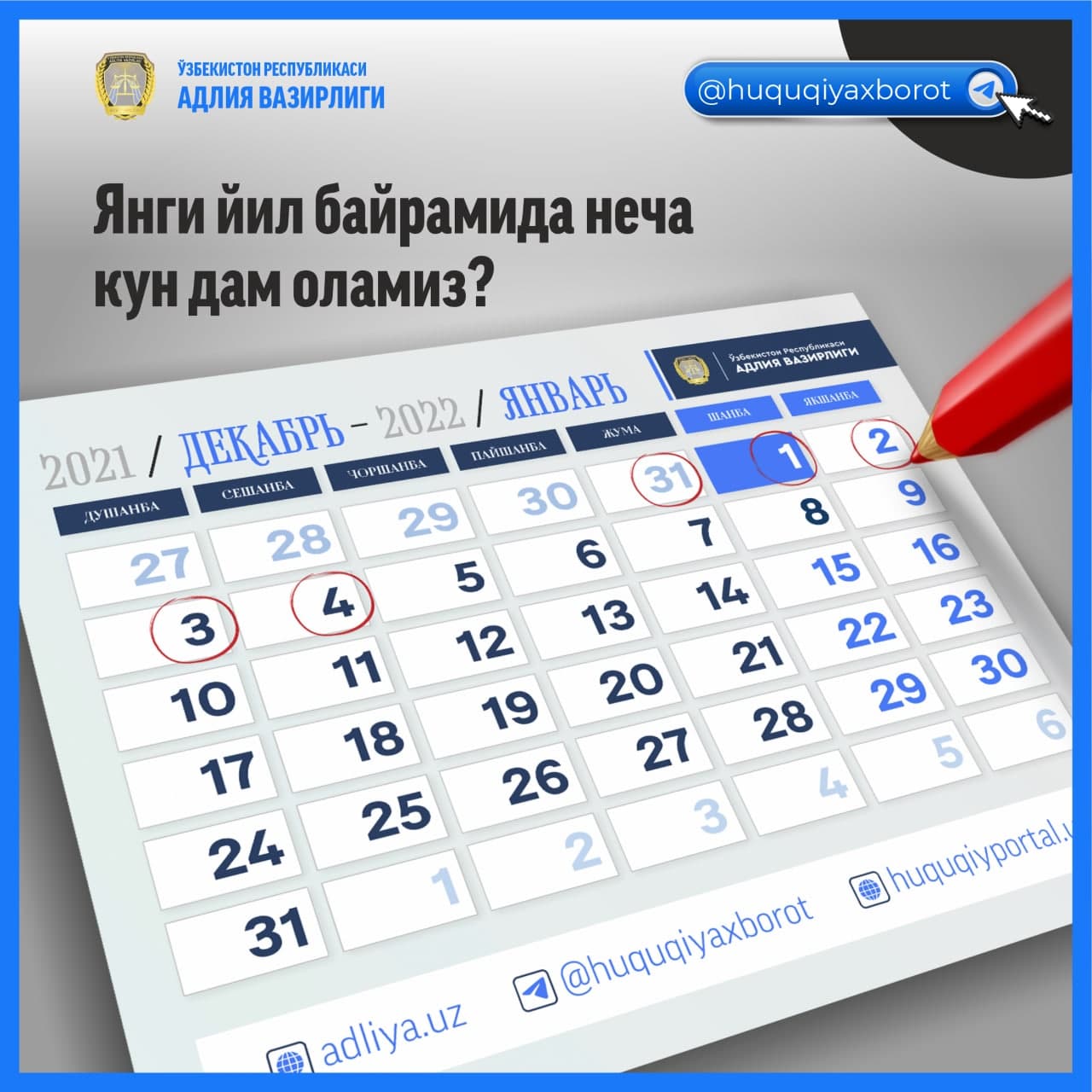 Yangi yil bayramida necha kun dam (https://t.me/huquqiyaxborot/10897) olamiz?