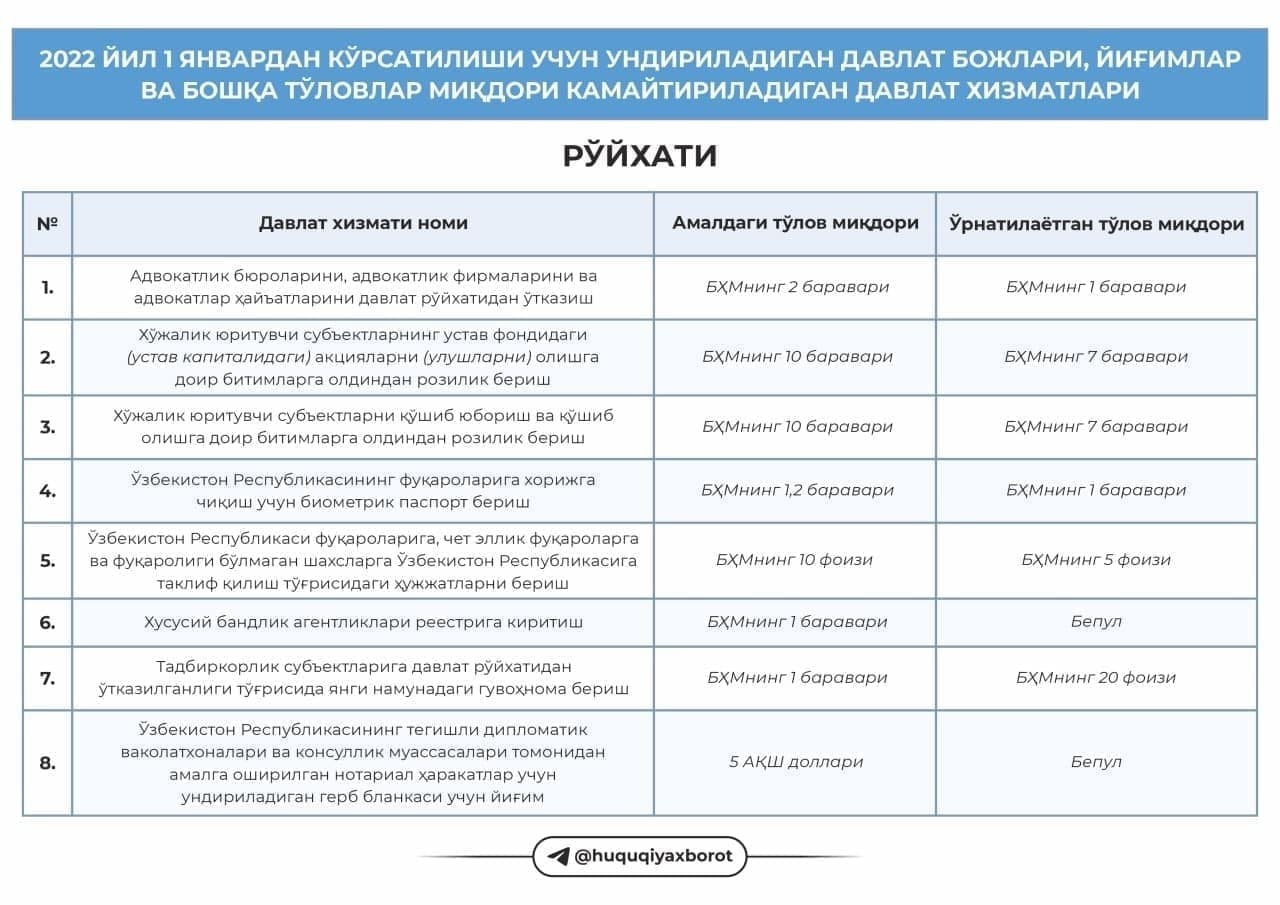 2022-yil 1-yanvardan ayrim davlat xizmatlari koʻrsatilishida  undiriladigan davlat bojlari, yigʻimlar va boshqa toʻlovlar miqdori kamaytirilgan (https://www.lex.uz/docs/5530487)