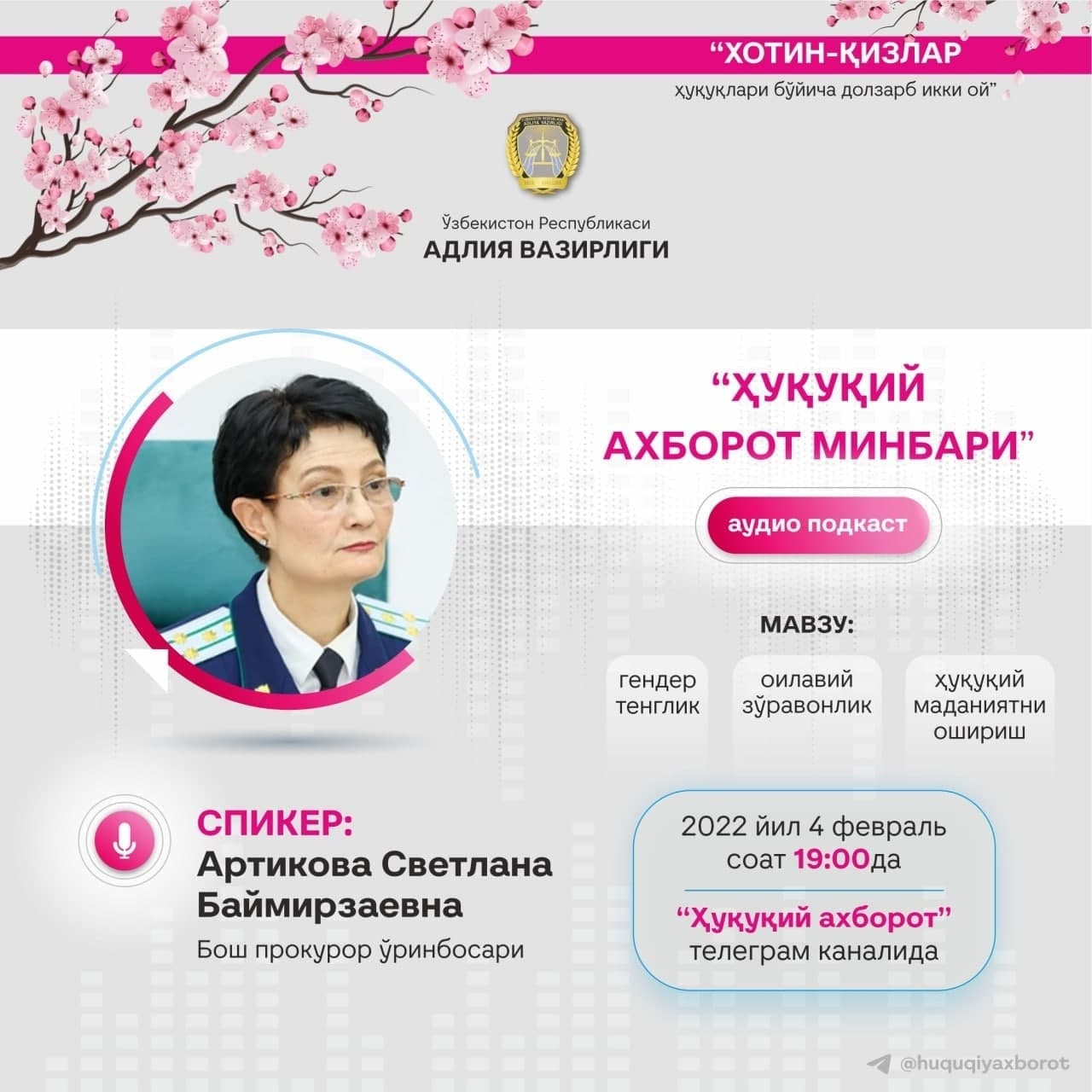 Adliya vazirligining “Xotin-qizlar huquqlari boʻyicha dolzarb ikki oy” loyihasi doirasida audio podkast tashkil etiladi.