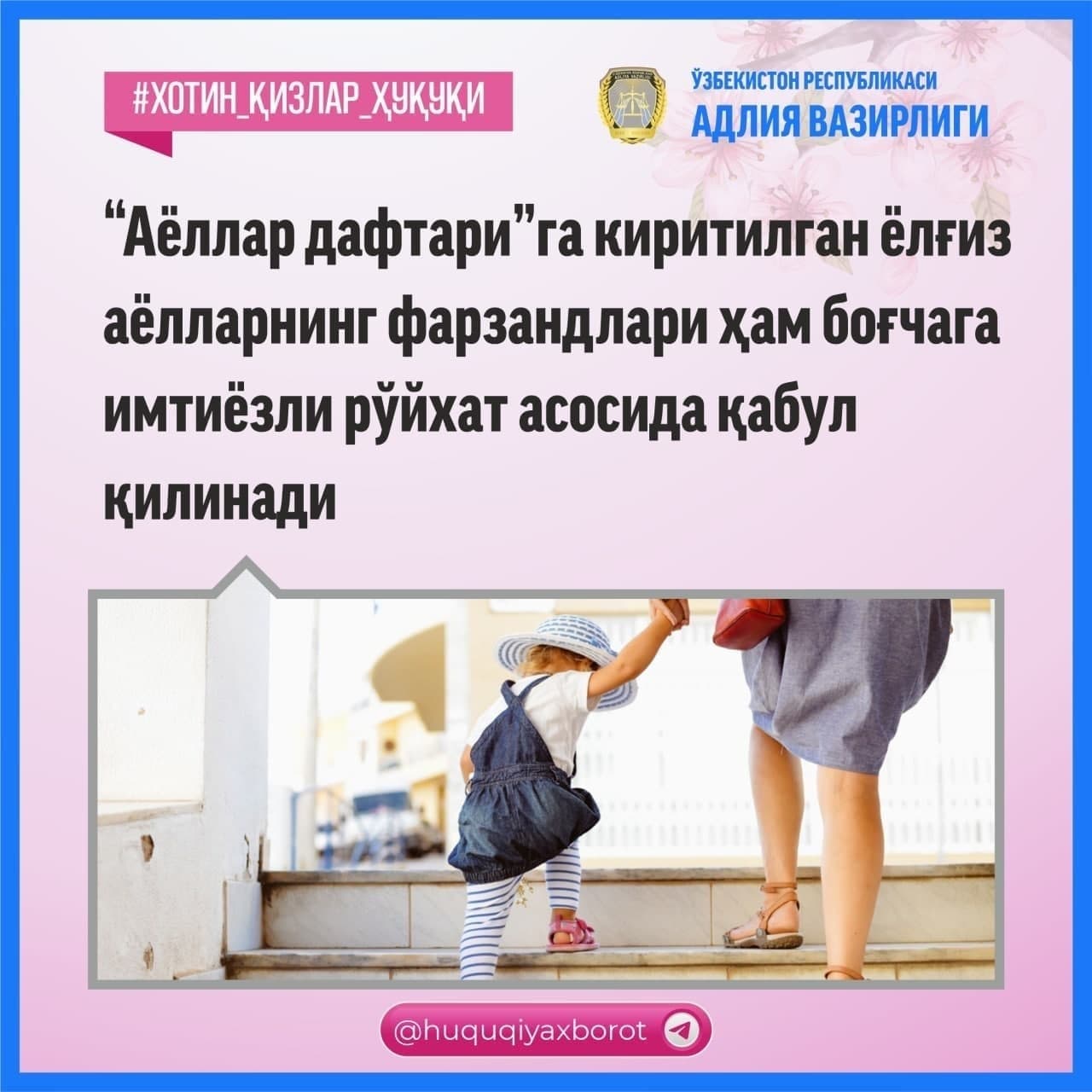 “Ayollar daftari”ga kiritilgan ijtimoiy himoyaga muhtoj yolgʻiz ayollarning bolalari davlat maktabgacha taʼlim tashkilotlariga ustunlik bilan qabul qilinish huquqiga ega (https://lex.uz/docs/5429899).