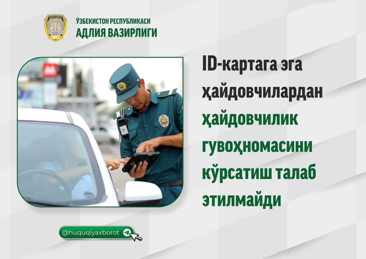 Haydovchi yonida pasporti yoki ID-kartasi boʻlganida quyidagi hujjatlarni olib yurishi talab etilmaydi (https://t.me/huquqiyaxborot/10791):