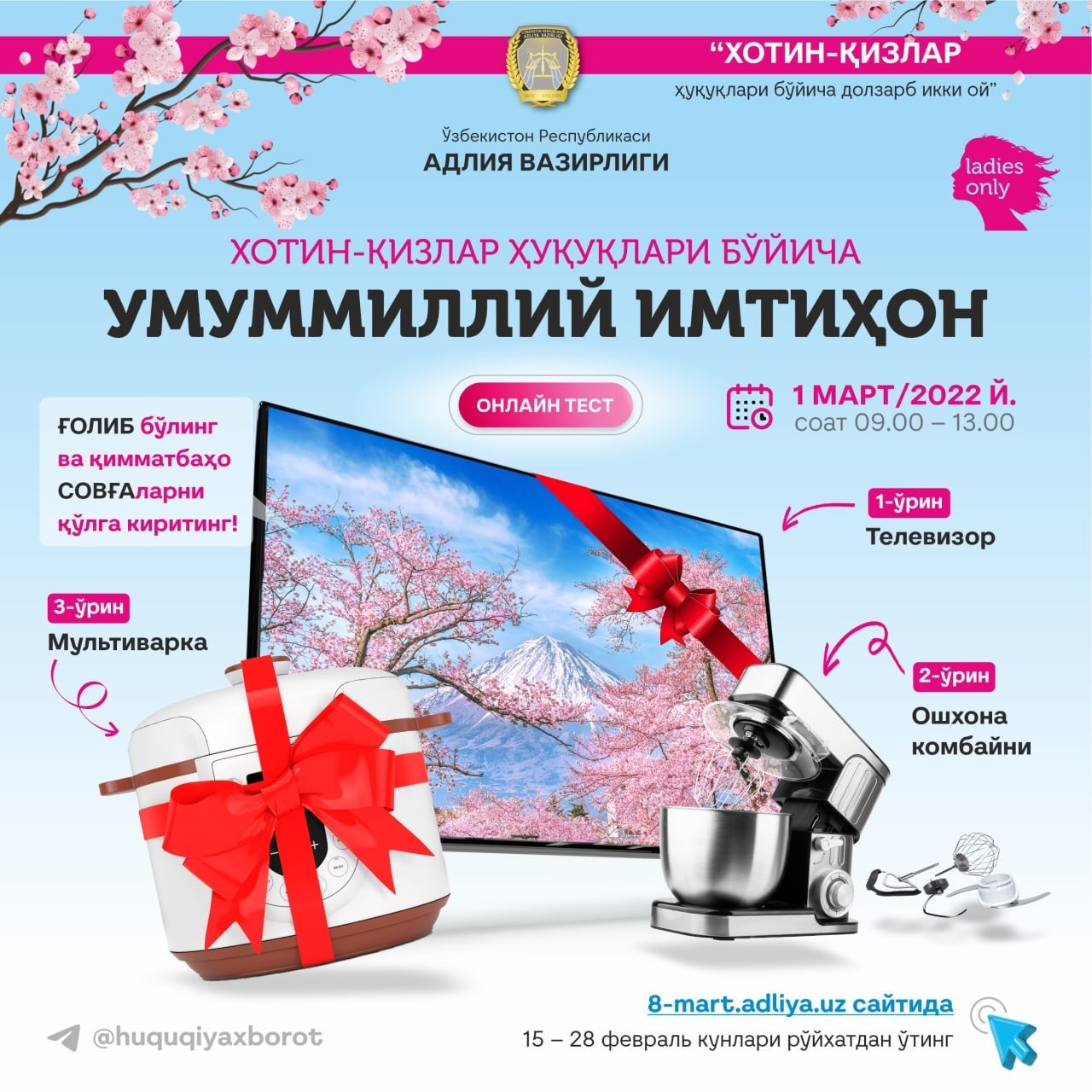 Imtihonda qatnashish uchun 8-mart.adliya.uz saytida roʻyxatdan oʻting.