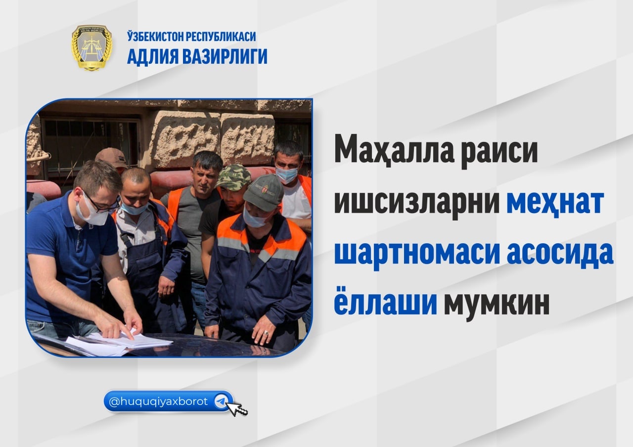 Mahalla raisi mahalla hududida yashaydigan ishsiz shaxslarni jamoat ishlariga jalb qilish uchun ular bilan mehnat shartnomalari tuzish huquqiga ega va ularning mehnatiga haq Jamoat ishlari jamgʻarmasi mablagʻlari hisobidan haq toʻlanadi.