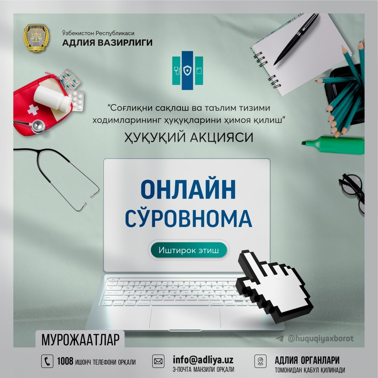 Xabaringiz bor, Adliya vazirligi tomonidan 2022-yil 15-martdan 15-maygacha “Sogʻliqni saqlash va taʼlim tizimi xodimlarining huquqlarini himoya qilish” huquqiy aksiyasi oʻtkazilmoqda.