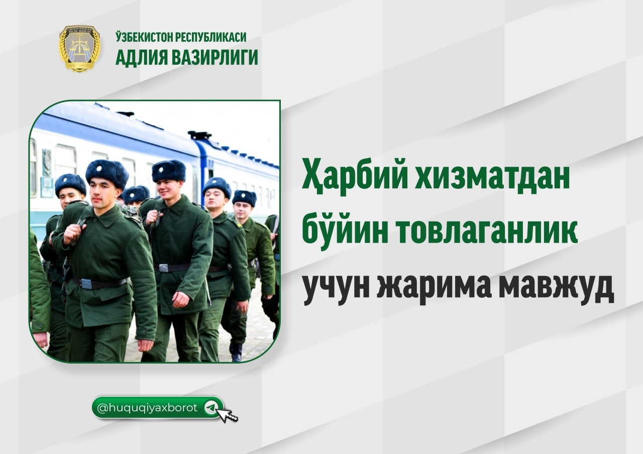 Muddatli harbiy xizmat yoki muqobil xizmatga chaqiruvdan, safarbarlik chaqiruvi rezervi xizmati safiga olinishdan yoki xizmatni Qurolli Kuchlar rezervida oʻtashdan boʻyin tovlash BHMning 2 baravaridan 5 baravarigacha (540 ming soʻmdan 1 mln 350 ming soʻmgacha) miqdorda jarima (https://lex.uz/docs/97664) solishga sabab boʻladi.