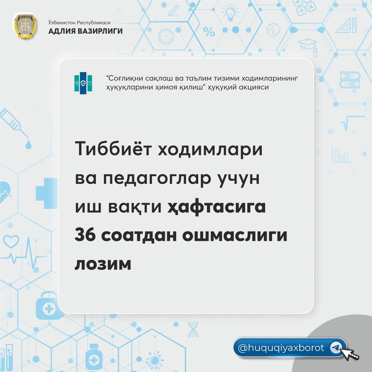 Yuqori darajadagi his-hayajon, aqliy zoʻriqish, asab tangligi bilan bogʻliq, yaʼni alohida tusga ega boʻlgan ishlardagi ayrim toifadagi xodimlar uchun (tibbiyot xodimlari, pedagoglar va boshqalar) ish vaqtining muddati haftasiga 36 soatdan oshmaydigan qilib belgilanadi (https://lex.uz/docs/142859#144369).