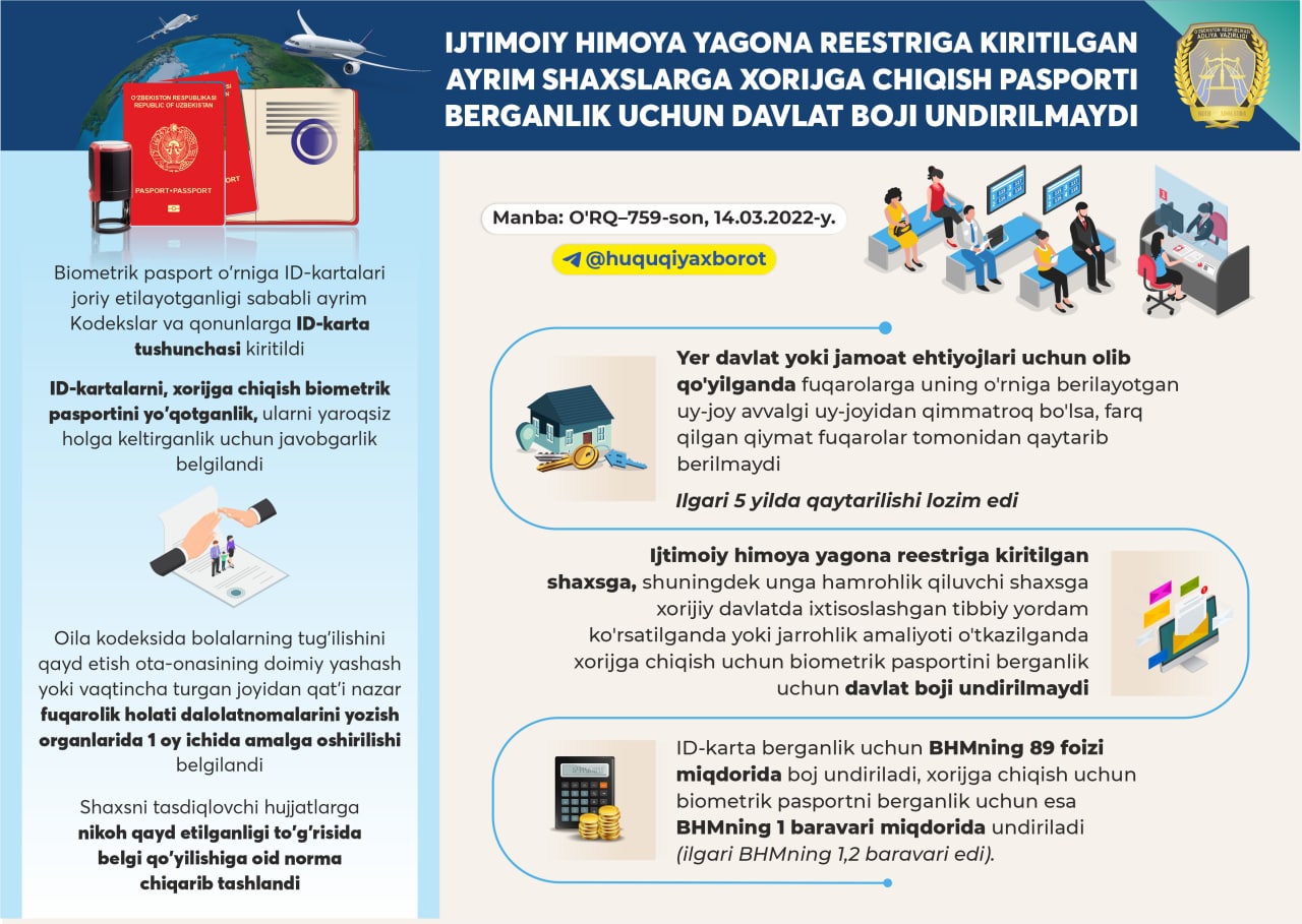 Ijtimoiy himoya yagona reestriga kiritilgan ayrim shaxslarga xorijga chiqish pasporti berganlik uchun davlat boji undirilmaydi