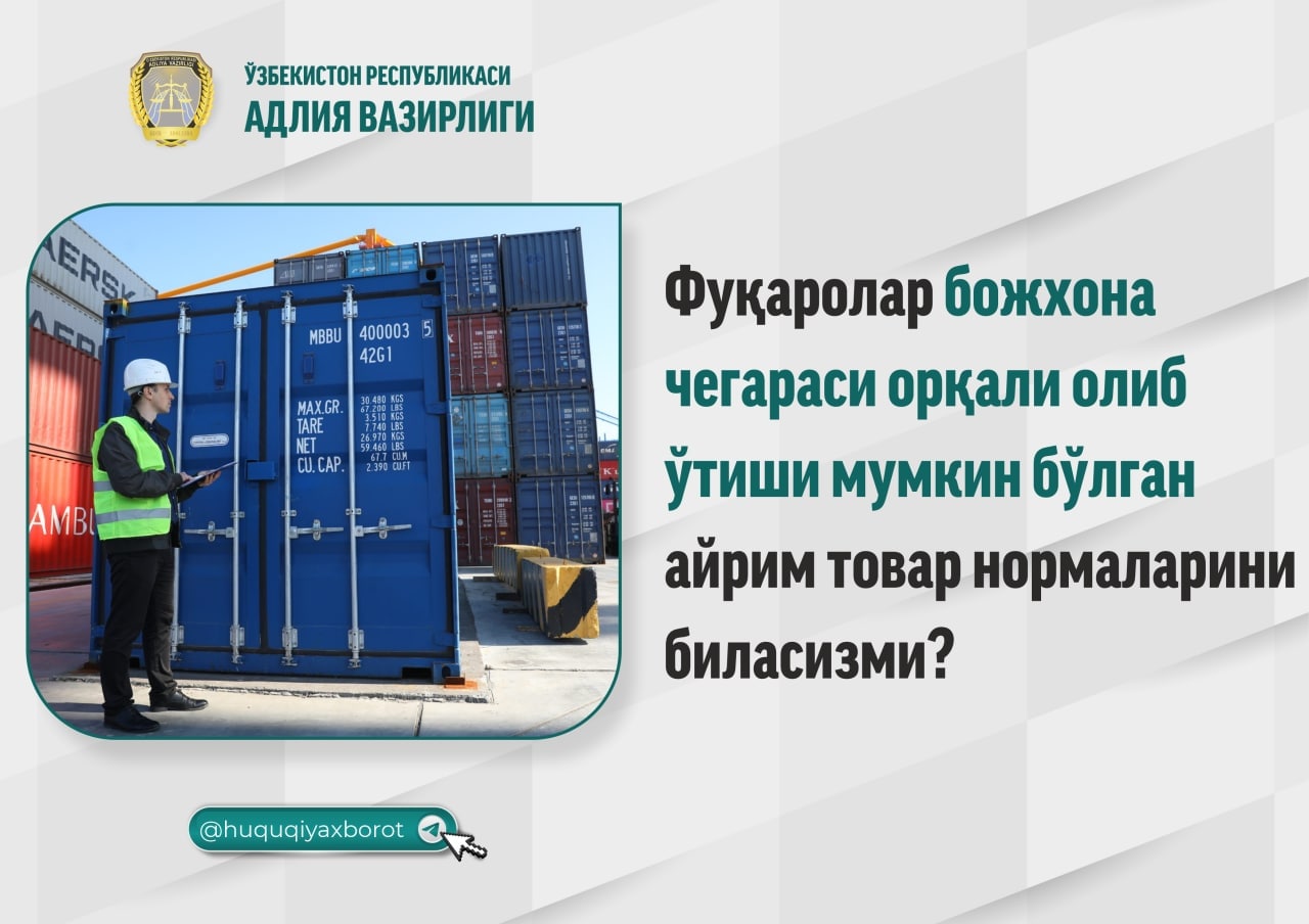 Jismoniy shaxslar tomonidan olib ketiladigan ayrim tovarlarning turlari normalari (https://lex.uz/docs/3551264#4461473):