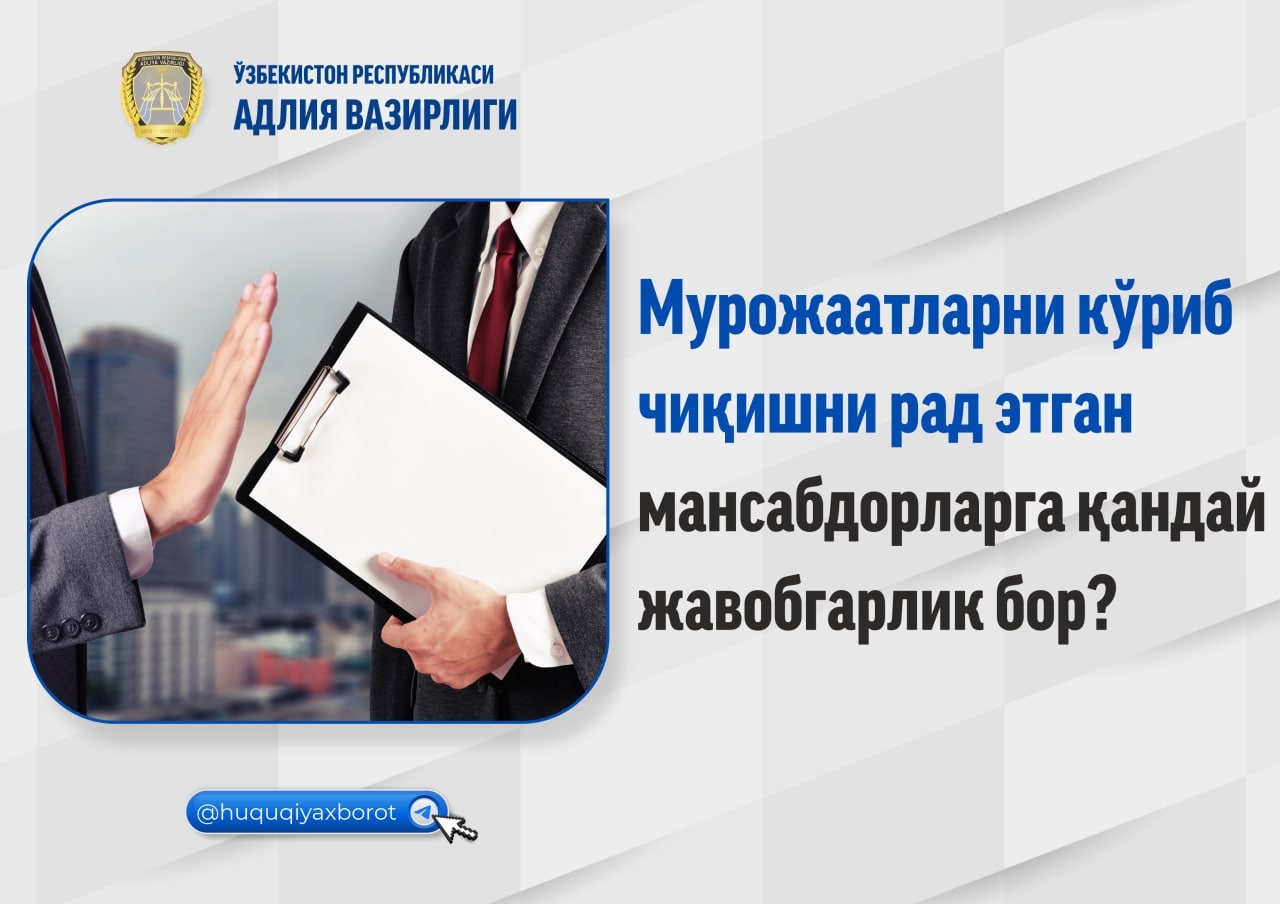 Qonunchilikka koʻra (https://lex.uz/docs/97664), quyidagi harakatlar jismoniy va yuridik shaxslarning murojaatlari toʻgʻrisidagi qonun hujjatlarini buzish hisoblanadi: