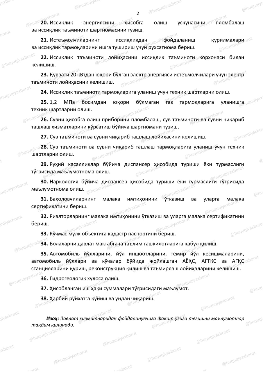 Farmon (https://t.me/huquqiyaxborot/11549) bilan tasdiqlangan roʻyxatga koʻra, 2022-yil 1-iyundan 38 turdagi davlat xizmatlarini YAIDXPda elektron raqamli imzo bilan tasdiqlash talab etilmaydi