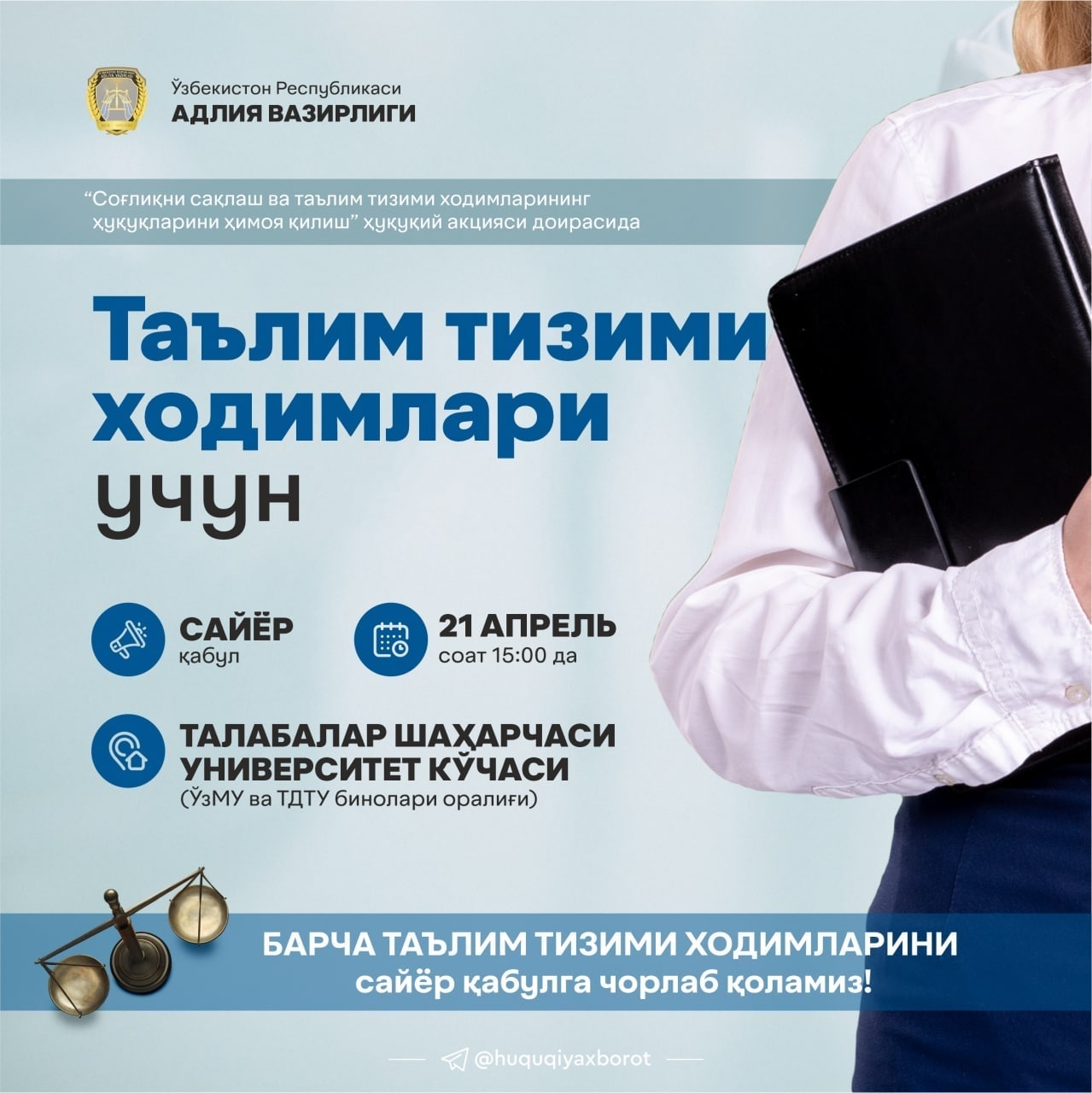 Adliya vazirligi tomonidan “Sogʻliqni saqlash va taʼlim tizimi xodimlarining huquqlarini himoya qilish” aksiyasi doirasida sayyor qabul oʻtkaziladi.