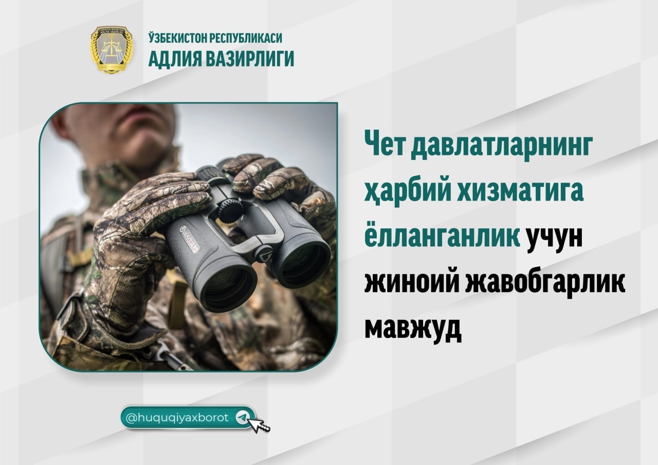 Oʻzbekiston fuqarosining chet davlatlarning harbiy xizmatiga, xavfsizlik, politsiya, harbiy adliya organlari yoki shunga oʻxshash boshqa organlariga xizmatga yollanishi 5 yilgacha ozodlikdan mahrum qilish bilan jazolanishi mumkin (https://lex.uz/docs/111453).