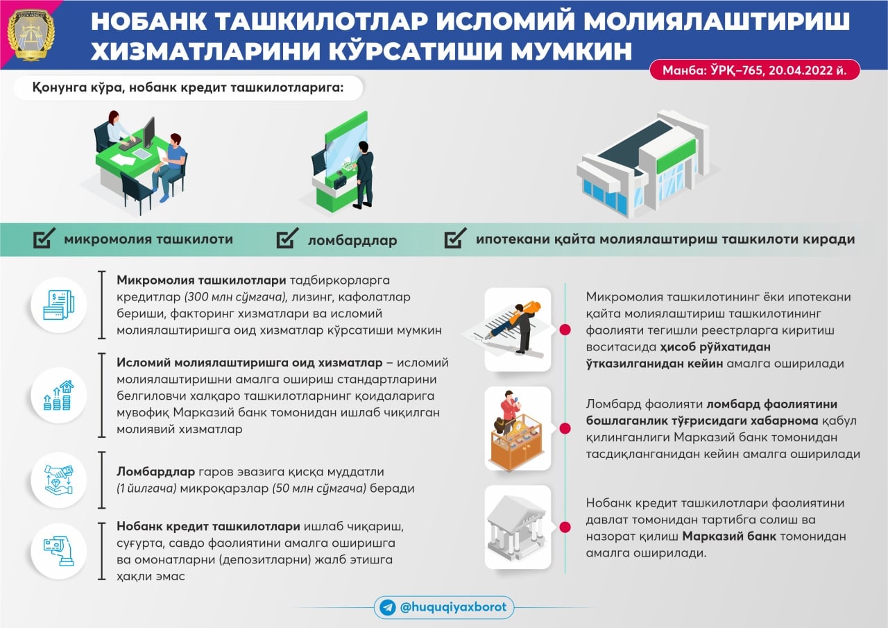 Nobank tashkilotlar islomiy moliyalashtirish xizmatlarini koʻrsatishi mumkin