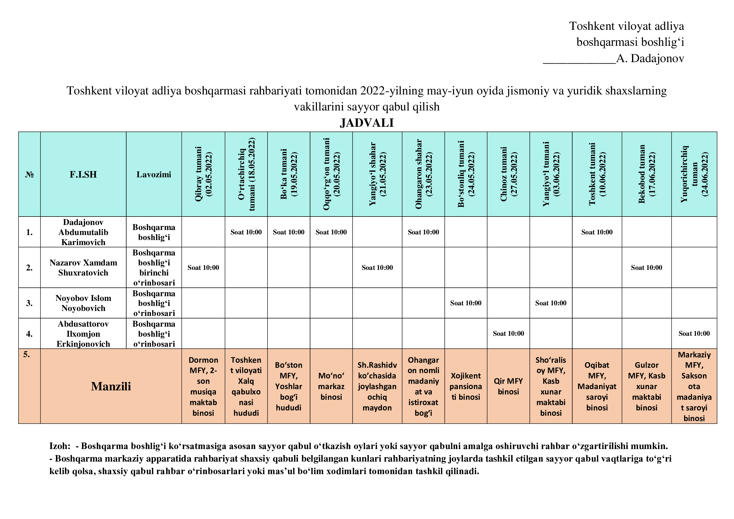 Toshkent viloyat adliya boshqarmasi rahbariyati tomonidan 2022-yilning may-iyun oyida jismoniy va yuridik shaxslarning vakillarini sayyor qabul qilish jadvali