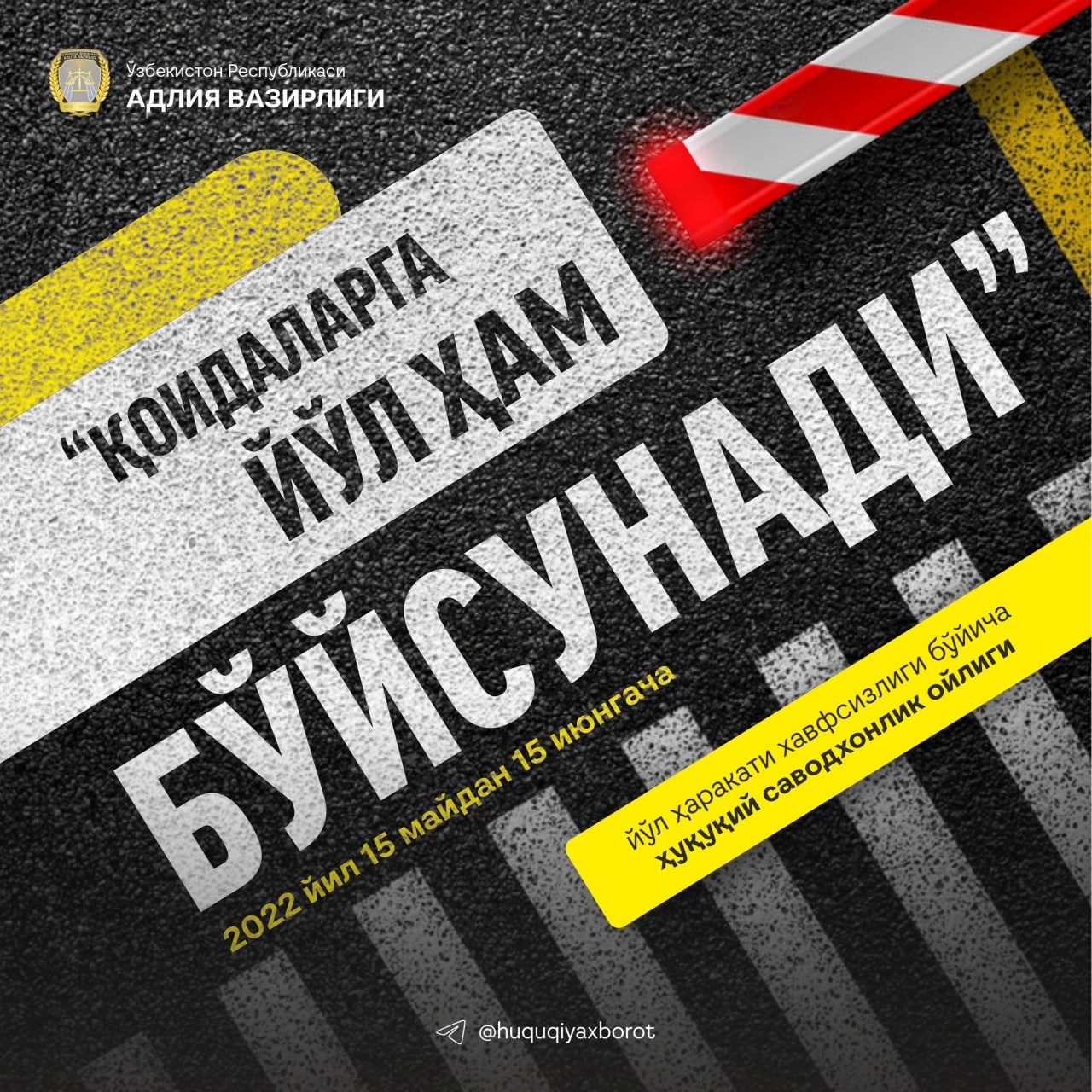Adliya vazirligi tomonidan joriy yil 15-maydan 15-iyunga qadar “Qoidalarga yoʻl ham boʻysunadi” shiori ostida yoʻl harakati xavfsizligi boʻyicha huquqiy savodxonlik oyligi eʼlon qilinadi.