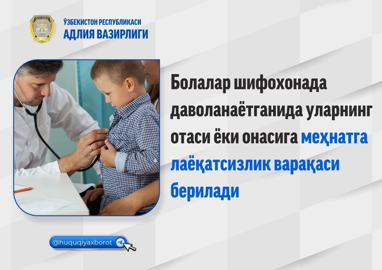 Uch yoshga toʻlmagan bolalar, shuningdek shifokorlarning xulosasiga koʻra qoʻshimcha qarovga muhtoj boʻlgan katta yoshdagi kasali ogʻir bolalar statsionar shifoxonada davolanayotganida ularning otasi yoki onasiga yoxud oilaning bolani bevosita parvarishlayotgan boshqa aʼzosiga davolash muassasasida uning yonida birga boʻlishi uchun imkoniyat yaratiladi va mehnatga layoqatsizlik varaqasi beriladi (https://www.lex.uz/docs/26013).
