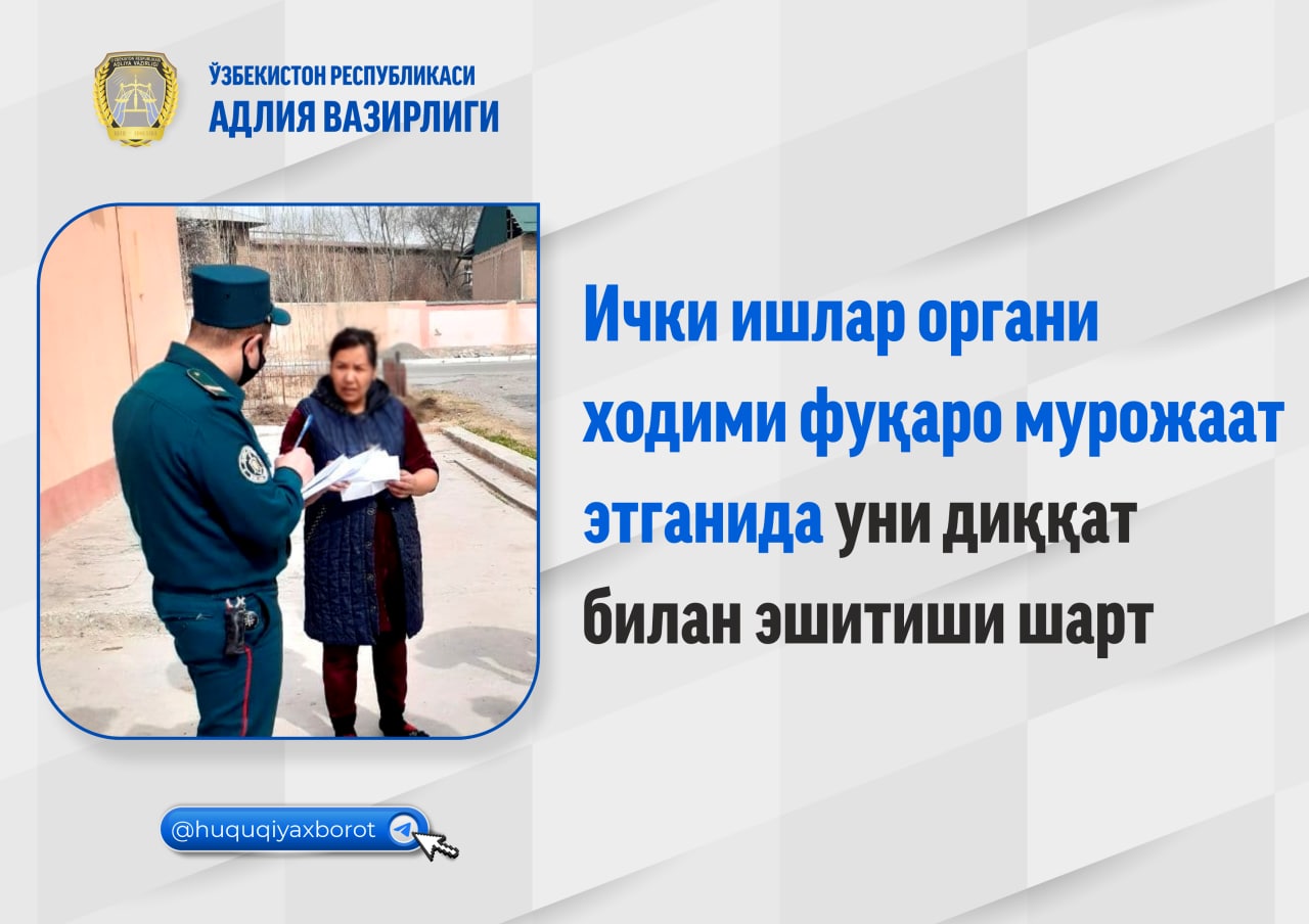 Ichki ishlar organi xodimi oʻziga fuqaro murojaat etgan taqdirda, oʻz lavozimini, unvonini, familiyasini, ismini, otasining ismini aytishi, uni diqqat bilan eshitishi, oʻz vakolatlari doirasida tegishli choralar koʻrishi yoxud qoʻyilgan masalani hal etish kimning vakolatiga kirishini tushuntirishi shart.