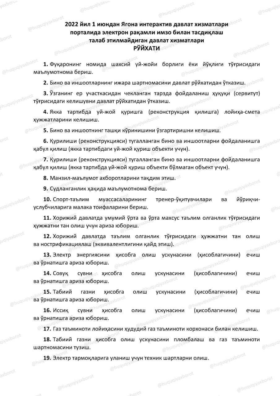 38 turdagi davlat xizmatlarini YAIDXPda elektron raqamli imzo bilan tasdiqlash talab etilmaydi