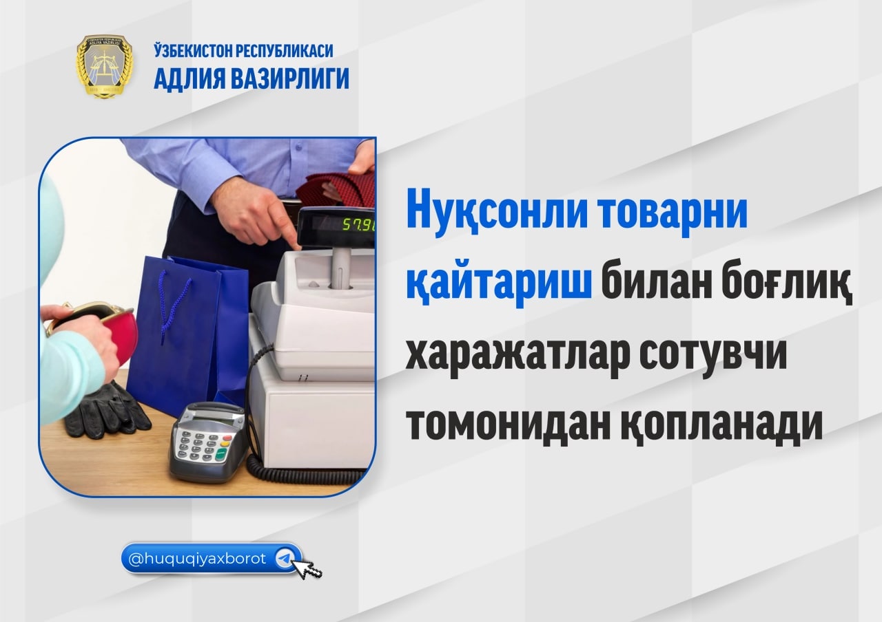 ️ Ushbu majburiyat bajarilmagan taqdirda tovarni eltish va qaytarib olib kelish isteʼmolchi tomonidan amalga oshirilishi mumkin. Bunda isteʼmolchining tovarni eltish va qaytarib olib ketish bilan bogʻliq xarajatlarini sotuvchi (ishlab chiqaruvchi) qoplashi shart.