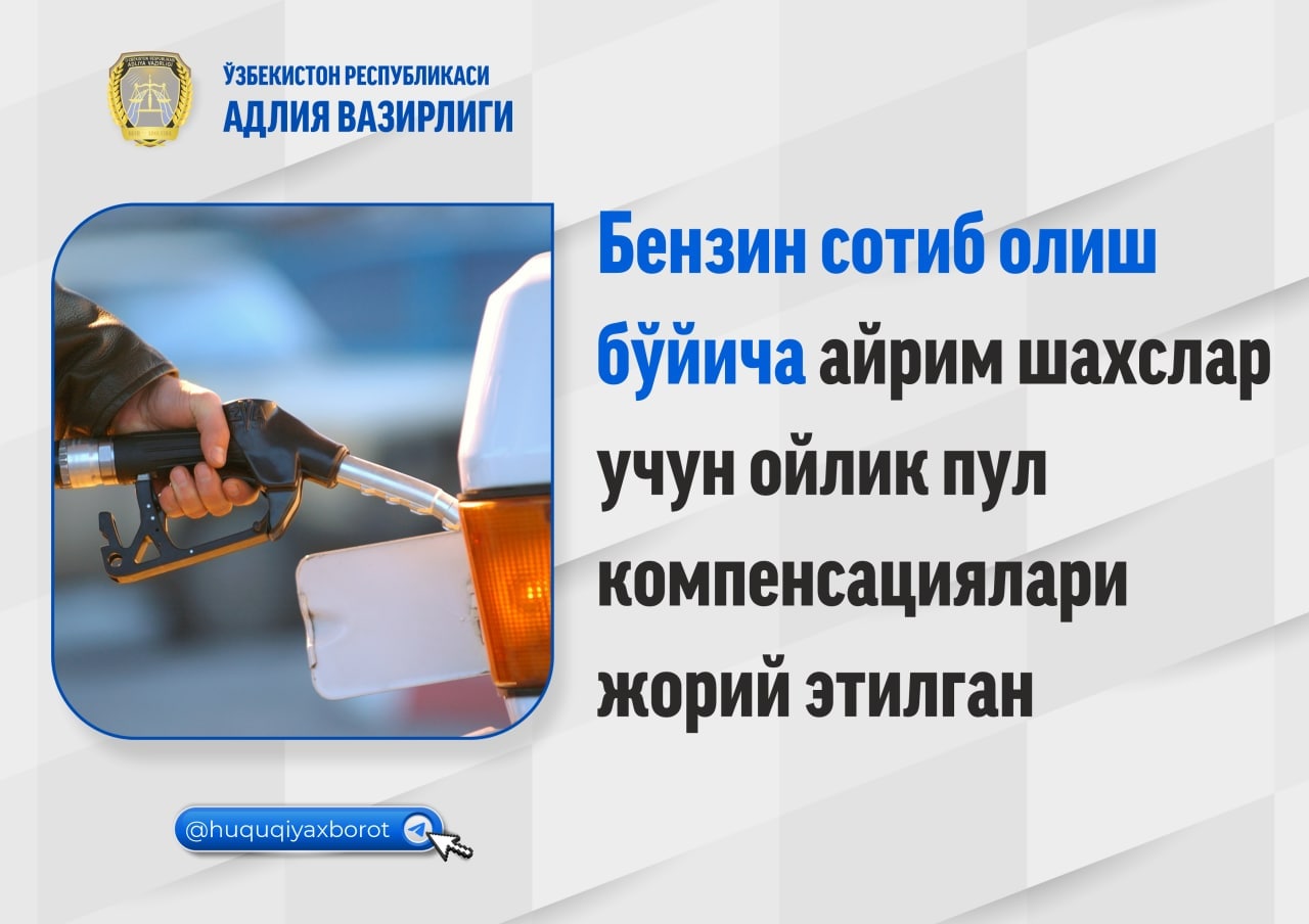 Avtomobil benzini sotib olish boʻyicha quyidagi shaxslar uchun oylik pul kompensatsiyalari toʻlovlari joriy etilgan:
