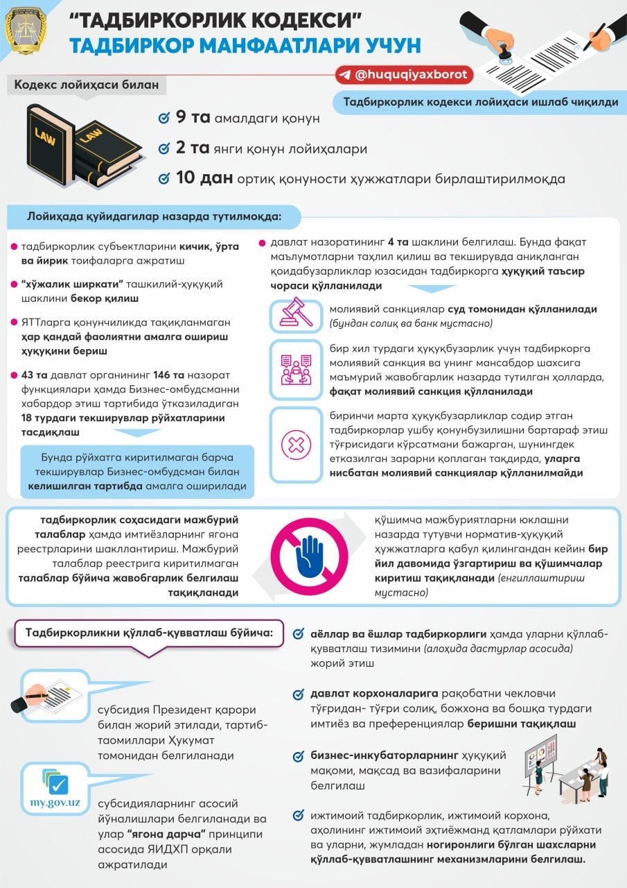 Adliya vazirligi tomonidan Tadbirkorlik kodeksi loyihasi ishlab chiqildi va jamoatchilik muhokamasiga qoʻyildi.