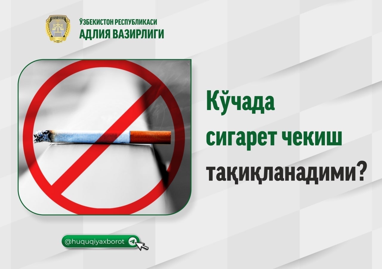 Qonunchilikka (https://lex.uz/docs/97664) koʻra, ish joylarida, sogʻliqni saqlash, taʼlim, sport-sogʻlomlashtirish muassasalarida, yongʻin chiqish xavfi boʻlgan joylarda, shu jumladan avtomobillarga yoqilgʻi quyish shoxobchalarida va boshqa jamoat joylarida (https://t.me/huquqiyaxborot/8035) tamaki mahsulotini isteʼmol qilish, BHM ning uchdan bir qismi (90 ming soʻm) miqdorida jarima solinishiga sabab boʻladi.