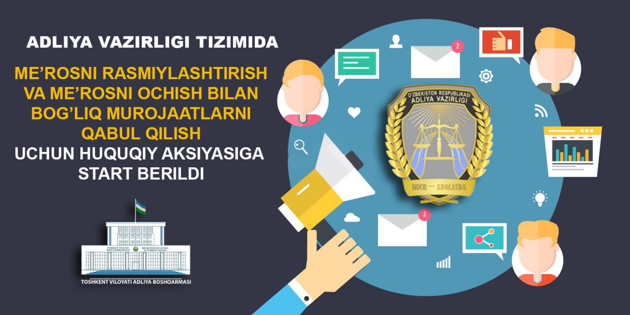 -- Адлия вазирлиги томонидан “Ворислик ҳуқуқи” бўйича аҳолининг ҳуқуқий маданиятини юксалтиришга қаратилган ҳуқуқий акция доирасида: