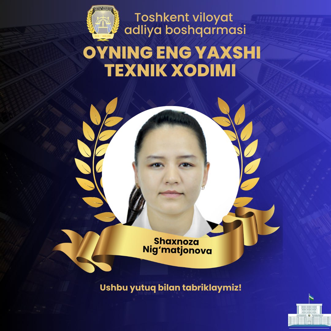“Oyning eng yaxshi texnik xodimi”ni aniqlash tartibi toʻgʻrisidagi nizomga asosan adliya organlarining tegishli Komissiyalari xulosasiga koʻra 2025-yil iyul oyining eng yaxshi texnik xodimi aniqlandi: