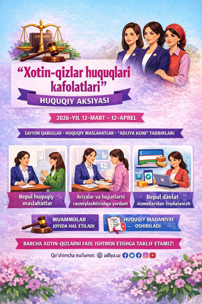 ❗️Adliya vazirligi tomonidan 2026-yil 12-martdan 12-aprelga qadar respublika bo‘ylab “Xotin-qizlar huquqlari kafolatlari” huquqiy aksiyasi o‘tkazilmoqda.
